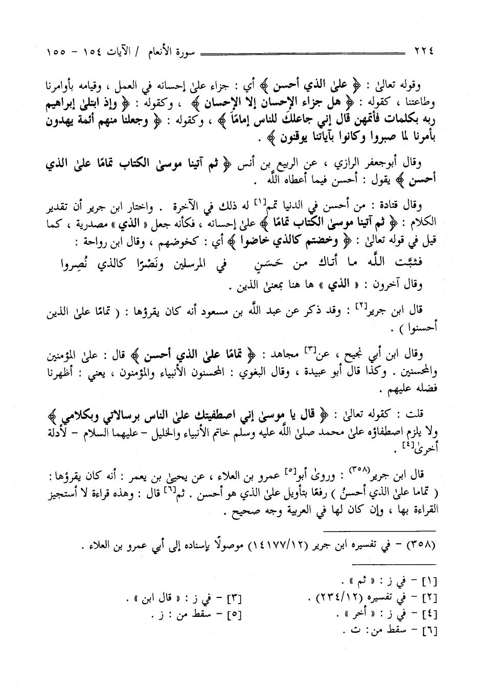 وَقَوْله تَعَالَى " عَلَى الَّذِي أَحْسَن " أَيْ جَزَاء عَلَى إِحْسَانه فِي الْعَمَل وَقِيَامه بِأَوَامِرِنَا وَطَاعَتنَا كَقَوْلِهِ " هَلْ جَزَاء الْإِحْسَان إِلَّا الْإِحْسَان " وَكَقَوْلِهِ " وَإِذْ اِبْتَلَى إِبْرَاهِيم رَبّه بِكَلِمَاتٍ فَأَتَمّهنَّ قَالَ إِنِّي جَاعِلك لِلنَّاسِ إِمَامًا " وَكَقَوْلِهِ" وَجَعَلْنَا مِنْهُمْ أَئِمَّة يَهْدُونَ بِأَمْرِنَا لَمَّا صَبَرُوا و كَانُوا بِآيَاتِنَا يُوقِنُونَ " وَقَالَ أَبُو جَعْفَر الرَّازِيّ عَنْ الرَّبِيع بْن أَنَس " ثُمَّ آتَيْنَا مُوسَى الْكِتَاب تَمَامًا عَلَى الَّذِي أَحْسَن " يَقُول أَحْسَن فِيمَا أَعْطَاهُ اللَّه وَقَالَ قَتَادَة مَنْ أَحْسَنَ فِي الدُّنْيَا تَمَّمَ لَهُ ذَلِكَ فِي الْآخِرَة وَاخْتَارَ اِبْن جَرِير أَنَّ تَقْدِيره " ثُمَّ آتَيْنَا مُوسَى الْكِتَاب تَمَامًا " عَلَى إِحْسَانه فَكَأَنَّهُ جَعَلَ الَّذِي مَصْدَرِيَّة كَمَا قِيلَ فِي قَوْله تَعَالَى " وَخُضْتُمْ كَاَلَّذِي خَاضُوا " أَيْ كَخَوْضِهِمْ وَقَالَ اِبْن رَوَاحَة .