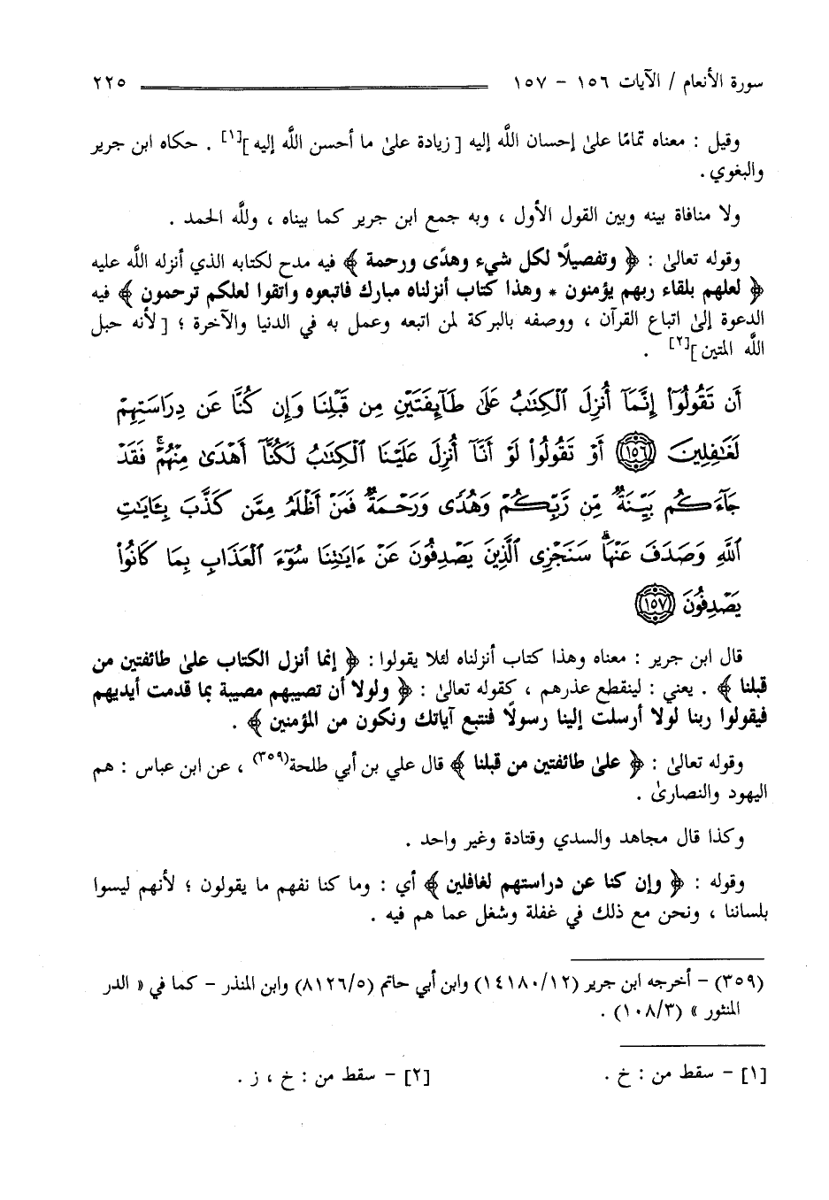 قَالَ اِبْن جَرِير مَعْنَاهُ وَهَذَا كِتَاب أَنْزَلْنَاهُ لِئَلَّا تَقُولُوا " إِنَّمَا أُنْزِلَ الْكِتَاب عَلَى طَائِفَتَيْنِ مِنْ قَبْلنَا " يَعْنِي لِيَنْقَطِع عُذْركُمْ كَقَوْلِهِ تَعَالَى " وَلَوْلَا أَنْ تُصِيبهُمْ مُصِيبَة بِمَا قَدَّمَتْ أَيْدِيهمْ فَيَقُولُوا رَبّنَا لَوْلَا أَرْسَلْت إِلَيْنَا رَسُولًا فَنَتَّبِع آيَاتك " الْآيَة .