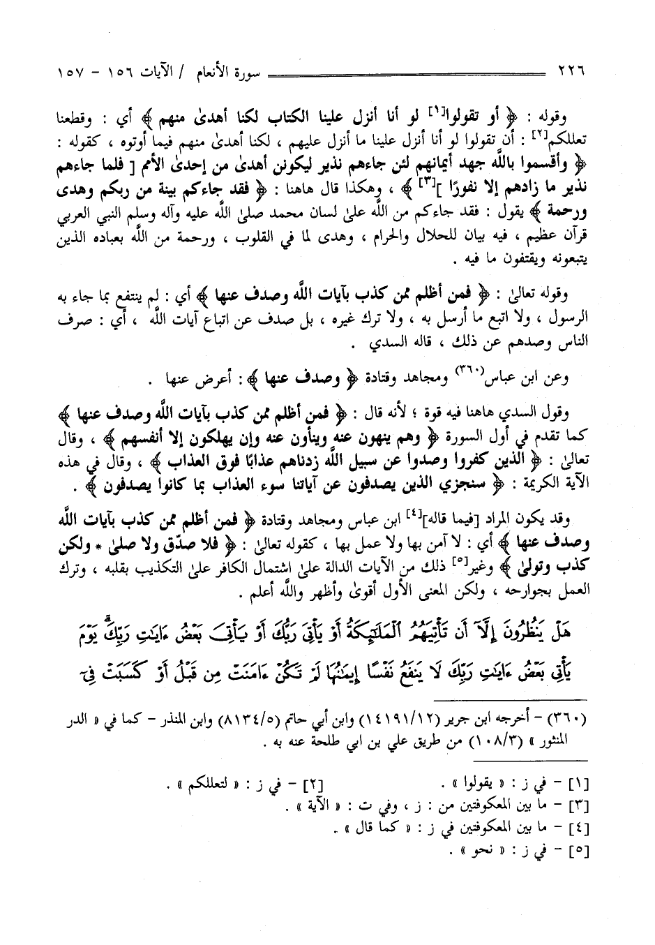أَوْ تَقُولُوا لَوْ أَنَّا أُنْزِلَ عَلَيْنَا الْكِتَابُ لَكُنَّا أَهْدَى مِنْهُمْ فَقَدْ جَاءَكُمْ بَيِّنَةٌ مِنْ رَبِّكُمْ وَهُدًى وَرَحْمَةٌ فَمَنْ أَظْلَمُ مِمَّنْ كَذَّبَ بِآَيَاتِ اللَّهِ وَصَدَفَ عَنْهَا سَنَجْزِي الَّذِينَ يَصْدِفُونَ عَنْ آَيَاتِنَا سُوءَ الْعَذَابِ بِمَا كَانُوا يَصْدِفُونَ (157)