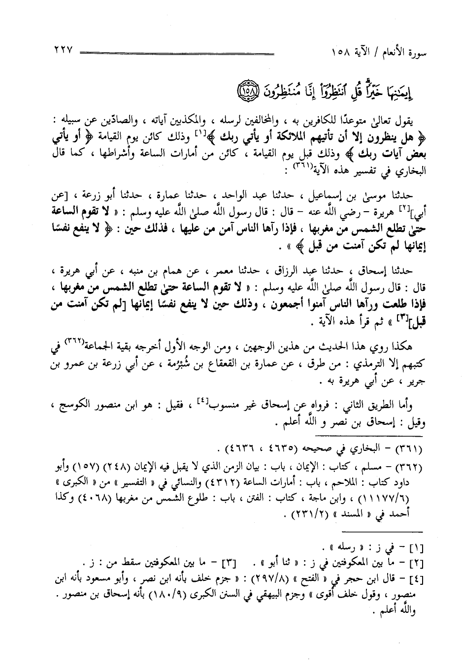 عَنْ سَبِيله" هَلْ يَنْظُرُونَ إِلَّا أَنْ تَأْتِيهِمْ الْمَلَائِكَة أَوْ يَأْتِي رَبّك " وَذَلِكَ كَائِن يَوْم الْقِيَامَة " أَوْ يَأْتِي بَعْض آيَات رَبّك يَوْم يَأْتِي بَعْض آيَات رَبّك لَا يَنْفَع نَفْسًا إِيمَانهَا" وَذَلِكَ قَبْل يَوْم الْقِيَامَة كَائِن مِنْ أَمَارَات السَّاعَة وَأَشْرَاطهَا كَمَا قَالَ الْبُخَارِيّ فِي تَفْسِير هَذِهِ الْآيَة حَدَّثَنَا مُوسَى بْن إِسْمَاعِيل حَدَّثَنَا عَبْد الْوَاحِد حَدَّثَنَا عُمَارَة حَدَّثَنَا أَبُو زُرْعَة عَنْ أَبِي هُرَيْرَة رَضِيَ اللَّه عَنْهُ قَالَ : قَالَ رَسُول اللَّه صَلَّى اللَّه عَلَيْهِ وَسَلَّمَ" لَا تَقُوم السَّاعَة حَتَّى تَطْلُع الشَّمْس مِنْ مَغْرِبهَا فَإِذَا رَآهَا النَّاس آمَنَ مَنْ عَلَيْهَا فَذَلِكَ حِين لَا يَنْفَع نَفْسًا إِيمَانهَا لَمْ تَكُنْ آمَنَتْ مِنْ قَبْل حَدَّثَنَا إِسْحَاق حَدَّثَنَا عَبْد الرَّزَّاق حَدَّثَنَا مَعْمَر عَنْ هَمَّام بْن مُنَبِّه عَنْ أَبِي هُرَيْرَة قَالَ : قَالَ رَسُول اللَّه صَلَّى اللَّه عَلَيْهِ وَعَلَى آله وَسَلَّمَ لَا تَقُوم السَّاعَة حَتَّى تَطْلُع الشَّمْس مِنْ مَغْرِبهَا وَفِي لَفْظ فَإِذَا طَلَعَتْ وَرَآهَا النَّاس آمَنُوا أَجْمَعُونَ وَذَلِكَ حِين لَا يَنْفَع نَفْسًا إِيمَانهَا لَمْ تَكُنْ آمَنَتْ مِنْ قَبْل ثُمَّ قَرَأَ هَذِهِ الْآيَة .