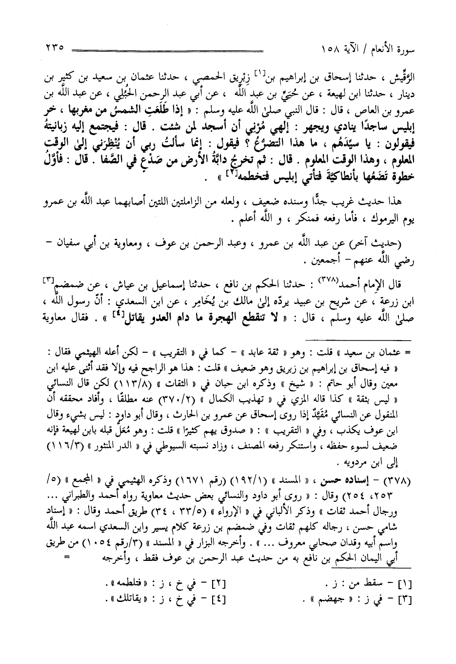 الرَّقِّيّ حَدَّثَنَا إِسْحَاق بْن إِبْرَاهِيم بْن زُرَيْق الْحِمْصِيّ حَدَّثَنَا عُثْمَان بْن سَعِيد بْن كَثِير بْن دِينَار حَدَّثَنَا اِبْن لَهِيعَة عَنْ يَحْيَى بْن عَبْد اللَّه عَنْ أَبِي عَبْد الرَّحْمَن الْحُبُلِيّ عَنْ عَبْد اللَّه بْن عَمْرو بْن الْعَاصِ قَالَ : قَالَ النَّبِيّ صَلَّى اللَّه عَلَيْهِ وَسَلَّمَ إِذَا طَلَعَتْ الشَّمْس مِنْ مَغْرِبهَا خَرَّ إِبْلِيس سَاجِدًا يُنَادِي وَيَجْهَر إِلَهِي مُرْنِي أَنْ أَسْجُد لِمَنْ شِئْت قَالَ فَيَجْتَمِع إِلَيْهِ زَبَانِيَته فَيَقُولُونَ كُلّهمْ مَا هَذَا التَّضَرُّع فَيَقُول إِنَّمَا سَأَلْت رَبِّي أَنْ يُنْظِرنِي إِلَى الْوَقْت الْمَعْلُوم وَهَذَا الْوَقْت الْمَعْلُوم قَالَ ثُمَّ تَخْرُج دَابَّة الْأَرْض مِنْ صَدْع فِي الصَّفَا قَالَ : فَأَوَّل خُطْوَة تَضَعهَا بِأَنْطَاكِيَا فَتَأْتِي إِبْلِيس فَتَلْطِمهُ هَذَا حَدِيث غَرِيب جِدًّا وَسَنَده ضَعِيف وَلَعَلَّهُ مِنْ الزَّامِلَتَيْنِ اللَّتَيْنِ أَصَابَهُمَا عَبْد اللَّه بْن عَمْرو يَوْم الْيَرْمُوك فَأَمَّا رَفْعه فَمُنْكَر وَاَللَّه أَعْلَم " حَدِيث آخَر " عَنْ عَبْد اللَّه بْن عَمْرو وَعَبْد الرَّحْمَن بْن عَوْف وَمُعَاوِيَة بْن أَبِي سُفْيَان رَضِيَ اللَّه عَنْهُمْ أَجْمَعِينَ قَالَ الْإِمَام أَحْمَد حَدَّثَنَا الْحَكَم بْن نَافِع حَدَّثَنَا إِسْمَاعِيل بْن عَيَّاش عَنْ ضَمْضَم بْن زُرْعَة عَنْ شُرَيْح بْن عُبَيْد يَرُدّهُ إِلَى مَالِك بْن يُخَامِر عَنْ اِبْن السَّعْدِيّ أَنَّ رَسُول اللَّه صَلَّى اللَّه عَلَيْهِ وَسَلَّمَ قَالَ لَا تَنْقَطِع الْهِجْرَة مَادَامَ الْعَدُوّ يُقَاتِل فَقَالَ مُعَاوِيَة