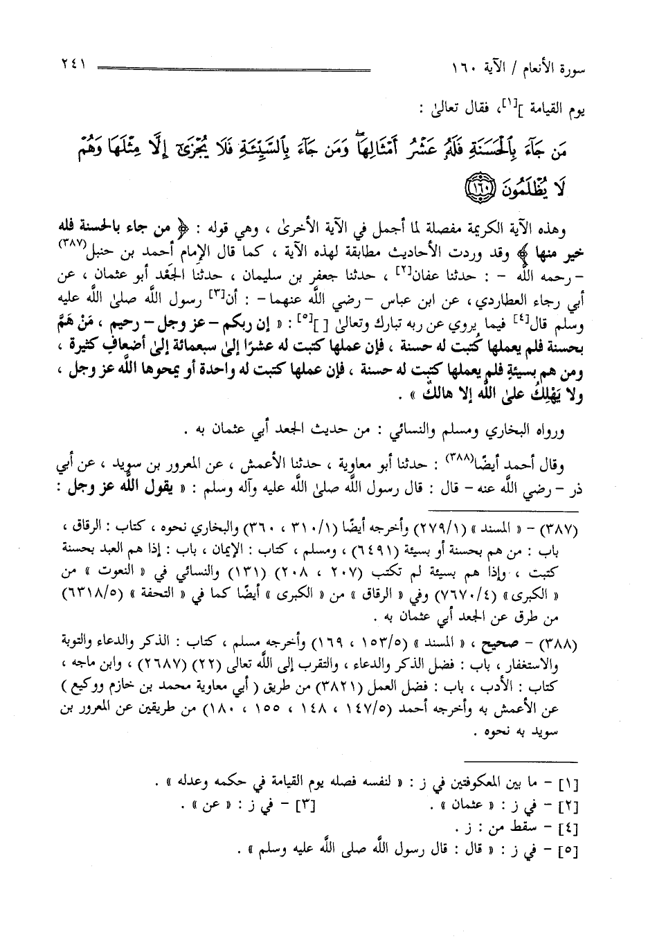 وَهَذِهِ الْآيَة الْكَرِيمَة مُفَصِّلَة لِمَا أُجْمِلَ فِي الْآيَة الْأُخْرَى وَهِيَ قَوْله " مَنْ جَاءَ بِالْحَسَنَةِ فَلَهُ خَيْر مِنْهَا " وَقَدْ وَرَدَتْ الْأَحَادِيث مُطَابِقَة لِهَذِهِ الْآيَة كَمَا قَالَ الْإِمَام أَحْمَد بْن حَنْبَل رَحِمَهُ اللَّه حَدَّثَنَا عَفَّان حَدَّثَنَا جَعْفَر بْن سُلَيْمَان حَدَّثَنَا الْجَعْد أَبُو عُثْمَان عَنْ أَبِي رَجَاء الْعُطَارِدِيّ عَنْ اِبْن عَبَّاس رَضِيَ اللَّه عَنْهُمَا أَنَّ رَسُول اللَّه صَلَّى اللَّه عَلَيْهِ وَسَلَّمَ قَالَ فِيمَا يَرْوِي عَنْ رَبّه تَبَارَكَ وَتَعَالَى إِنَّ رَبّكُمْ عَزَّ وَجَلَّ رَحِيم مَنْ هَمَّ بِحَسَنَةٍ فَلَمْ يَعْمَلهَا كُتِبَتْ لَهُ حَسَنَة فَإِنْ عَمِلَهَا كُتِبَتْ لَهُ عَشْرًا إِلَى سَبْعمِائَةٍ إِلَى أَضْعَاف كَثِيرَة .