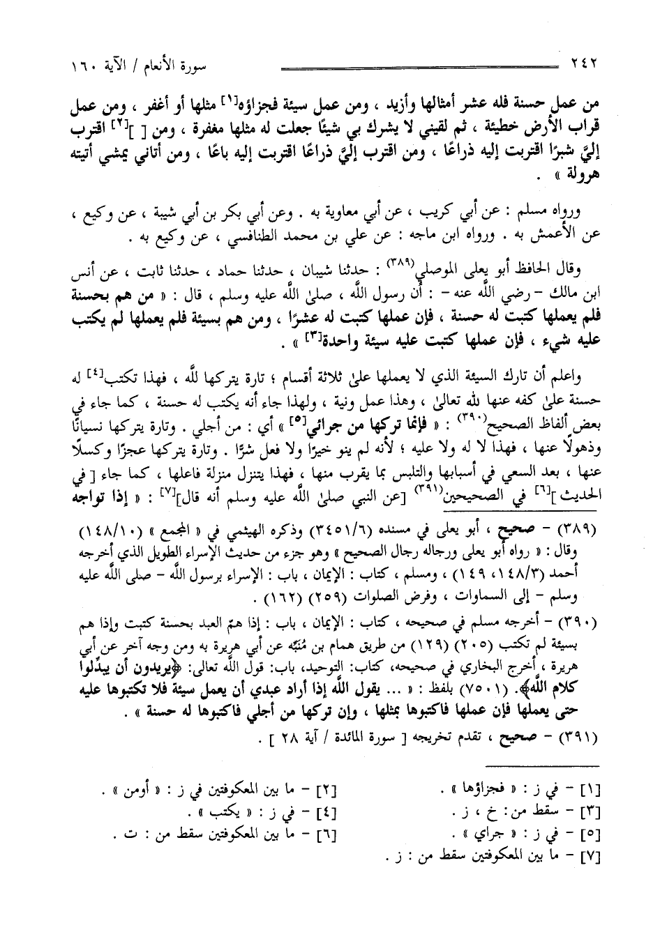 مَنْ عَمِلَ حَسَنَة فَلَهُ عَشْر أَمْثَالهَا وَأَزِيد وَمَنْ عَمِلَ سَيِّئَة فَجَزَاؤُهَا مِثْلهَا أَوْ أَغْفِر وَمَنْ عَمِلَ قُرَاب الْأَرْض خَطِيئَة ثُمَّ لَقِيَنِي لَا يُشْرِك بِي شَيْئًا جَعَلْت لَهُ مِثْلهَا مَغْفِرَة وَمَنْ اِقْتَرَبَ إِلَيَّ شِبْرًا اِقْتَرَبْت إِلَيْهِ ذِرَاعًا وَمَنْ اِقْتَرَبَ إِلَيَّ ذِرَاعًا اِقْتَرَبْت إِلَيْهِ بَاعًا وَمَنْ أَتَانِي يَمْشِي أَتَيْته هَرْوَلَة وَرَوَاهُ مُسْلِم عَنْ أَبِي كُرَيْب عَنْ أَبِي مُعَاوِيَة وَعَنْ أَبِي بَكْر بْن أَبِي شَيْبَة عَنْ وَكِيع عَنْ الْأَعْمَش بِهِ وَرَوَاهُ اِبْن مَاجَهْ عَنْ عَلِيّ بْن مُحَمَّد الطَّنَافُسِيّ عَنْ وَكِيع بِهِ .