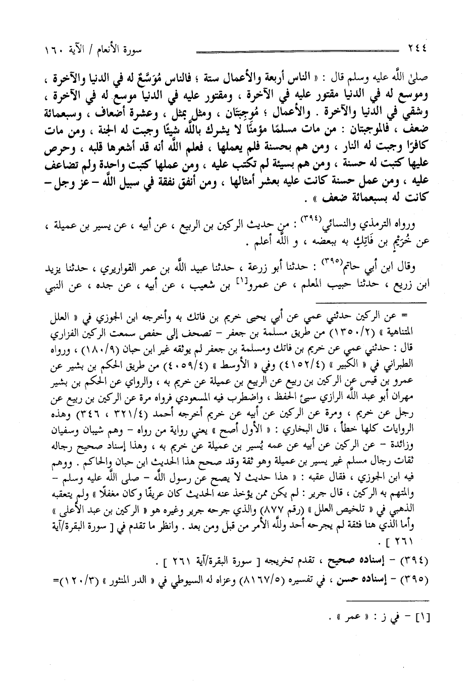 وَرَوَاهُ التِّرْمِذِيّ وَالنَّسَائِيّ مِنْ حَدِيث الرُّكَيْن بْن الرَّبِيع عَنْ أَبِيهِ عَنْ بَشِير بْن عُمَيْلَة عَنْ خُرَيْم بْن فَاتِك بِهِ بِبَعْضِهِ وَاَللَّه أَعْلَم وَقَالَ اِبْن أَبِي حَاتِم حَدَّثَنَا أَبُو زُرْعَة حَدَّثَنَا عُبَيْد اللَّه بْن عُمَر الْقَوَارِيرِيّ حَدَّثَنَا يَزِيد بْن زُرَيْع حَدَّثَنَا حَبِيب بْن الْمُعَلَّم عَنْ عَمْرو بْن شُعَيْب عَنْ أَبِيهِ عَنْ جَدّه عَنْ
