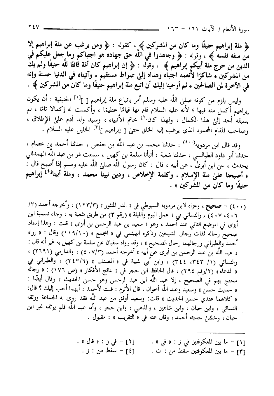 " كَقَوْلِهِ " وَمَنْ يَرْغَب عَنْ مِلَّة إِبْرَاهِيم إِلَّا مَنْ سَفِهَ نَفْسه " وَقَوْله " وَجَاهِدُوا فِي اللَّه حَقّ جِهَاده هُوَ اِجْتَبَاكُمْ وَمَا جَعَلَ عَلَيْكُمْ فِي الدِّين مِنْ حَرَج مِلَّة أَبِيكُمْ إِبْرَاهِيم " وَقَوْله " إِنَّ إِبْرَاهِيم كَانَ أُمَّة قَانِتًا لِلَّهِ حَنِيفًا وَلَمْ يَكُ مِنْ الْمُشْرِكِينَ شَاكِرًا لِأَنْعُمِهِ اِجْتَبَاهُ وَهَدَاهُ إِلَى صِرَاط مُسْتَقِيم وَآتَيْنَاهُ فِي الدُّنْيَا حَسَنَة وَإِنَّهُ فِي الْآخِرَة لَمِنْ الصَّالِحِينَ ثُمَّ أَوْحَيْنَا إِلَيْك أَنْ اِتَّبِعْ مِلَّة إِبْرَاهِيم حَنِيفًا وَمَا كَانَ مِنْ الْمُشْرِكِينَ " وَلَيْسَ يَلْزَم مِنْ كَوْنه صَلَّى اللَّه عَلَيْهِ وَسَلَّمَ أَمَرَ بِاتِّبَاعِ مِلَّة إِبْرَاهِيم الْحَنِيفِيَّة أَنْ يَكُون إِبْرَاهِيم أَكْمَل مِنْهُ فِيهَا لِأَنَّهُ عَلَيْهِ السَّلَام قَامَ بِهَا قِيَامًا عَظِيمًا وَأَكْمَلَتْ لَهُ إِكْمَالًا تَامًّا لَمْ يَسْبِقهُ أَحَد إِلَى هَذَا الْكَمَال وَلِهَذَا كَانَ خَاتَم الْأَنْبِيَاء وَسَيِّد وَلَد آدَم عَلَى الْإِطْلَاق وَصَاحِب الْمَقَام الْمَحْمُود الَّذِي يَرْغَب إِلَيْهِ الْخَلْق حَتَّى الْخَلِيل عَلَيْهِ السَّلَام وَقَدْ قَالَ اِبْن مَرْدُوَيْهِ حَدَّثَنَا مُحَمَّد بْن عَبْد اللَّه بْن حَفْص حَدَّثَنَا أَحْمَد بْن عِصَام حَدَّثَنَا أَبُو دَاوُد الطَّيَالِسِيّ حَدَّثَنَا شُعْبَة أَنْبَأَنَا سَلَمَة بْن كُهَيْل سَمِعْت ذِرّ بْن عَبْد اللَّه الْهَمْدَانِيّ يُحَدِّث عَنْ اِبْن أَبْزَى عَنْ أَبِيهِ قَالَ كَانَ رَسُول اللَّه صَلَّى اللَّه عَلَيْهِ وَسَلَّمَ إِذَا أَصْبَحَ قَالَ أَصْبَحْنَا عَلَى مِلَّة الْإِسْلَام وَكَلِمَة الْإِخْلَاص وَدِين نَبِيّنَا مُحَمَّد وَمِلَّة أَبِينَا إِبْرَاهِيم حَنِيفًا وَمَا كَانَ مِنْ الْمُشْرِكِينَ