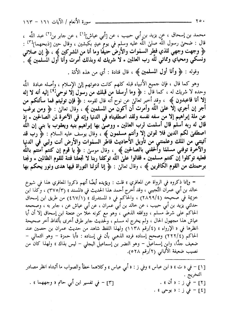 مُحَمَّد بْن إِسْحَاق عَنْ يَزِيد بْن أَبِي حَبِيب عَنْ اِبْن عَبَّاس عَنْ جَابِر بْن عَبْد اللَّه قَالَ : ضَحَّى رَسُول اللَّه صَلَّى اللَّه عَلَيْهِ وَسَلَّمَ فِي يَوْم عِيد النَّحْر بِكَبْشَيْنِ وَقَالَ حِين ذَبَحَهُمَا وَجَّهْت وَجْهِي لِلَّذِي فَطَرَ السَّمَوَات وَالْأَرْض حَنِيفًا وَمَا أَنَا مِنْ الْمُشْرِكِينَ.