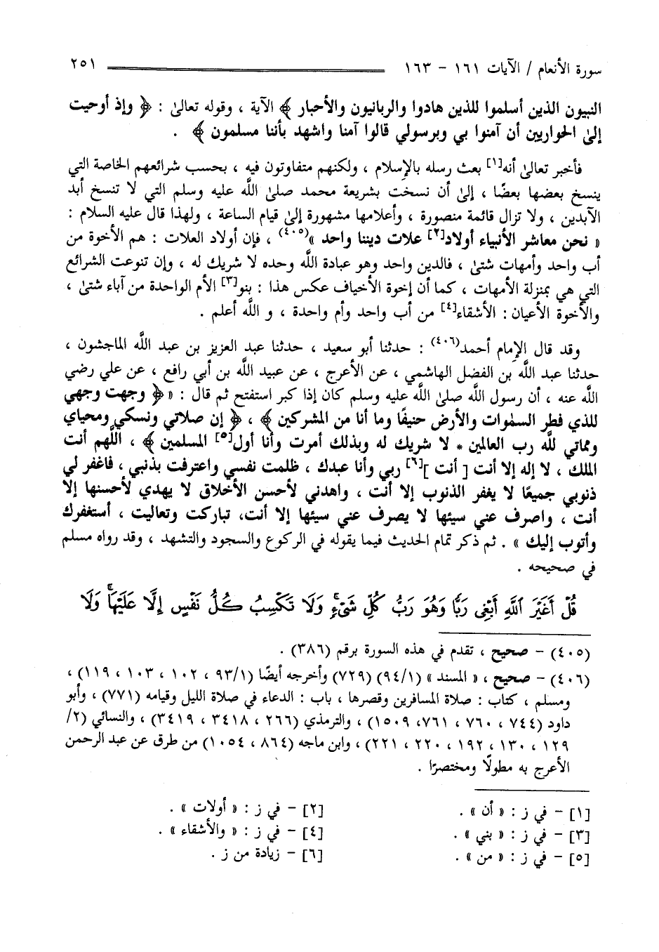 وَقَالَ تَعَالَى " وَإِذْ أَوْحَيْت إِلَى الْحَوَارِيِّينَ أَنْ آمِنُوا بِي وَبِرَسُولِي قَالُوا آمَنَّا وَاشْهَدْ بِأَنَّنَا مُسْلِمُونَ " فَأَخْبَرَ تَعَالَى أَنَّهُ بَعَثَ رُسُله بِالْإِسْلَامِ وَلَكِنَّهُمْ مُتَفَاوِتُونَ فِيهِ بِحَسْب شَرَائِعهمْ الْخَاصَّة الَّتِي يَنْسَخ بَعْضهَا بَعْضًا إِلَى أَنْ نُسِخَتْ بِشَرِيعَةِ مُحَمَّد صَلَّى اللَّه عَلَيْهِ وَسَلَّمَ الَّتِي لَا تُنْسَخ أَبَد الْآبِدِينَ وَلَا تَزَال قَائِمَة مَنْصُورَة وَأَعْلَامهَا مَنْشُورَة إِلَى قِيَام السَّاعَة وَلِهَذَا قَالَ عَلَيْهِ السَّلَام نَحْنُ مَعَاشِر الْأَنْبِيَاء أَوْلَاد عَلَّات دِيننَا وَاحِد فَإِنَّ أَوْلَاد الْعَلَّات هُمْ الْإِخْوَة مِنْ أَب وَاحِد وَأُمَّهَات شَتَّى فَالدِّين وَاحِد وَهُوَ عِبَادَة اللَّه وَحْده لَا شَرِيك لَهُ وَإِنْ تَنَوَّعَتْ الشَّرَائِع الَّتِي هِيَ بِمَنْزِلَةِ الْأُمَّهَات كَمَا أَنَّ إِخْوَة الْأَخْيَاف عَكْس هَذَا بَنُو الْأُمّ الْوَاحِدَة مِنْ آبَاء شَتَّى وَالْإِخْوَة الْأَعْيَان الْأَشِقَّاء مِنْ أَب وَاحِد وَأُمّ وَاحِدَة وَاَللَّه أَعْلَم وَقَدْ قَالَ الْإِمَام أَحْمَد حَدَّثَنَا أَبُو سَعِيد حَدَّثَنَا عَبْد الْعَزِيز بْن عَبْد اللَّه الْمَاجِشُون حَدَّثَنَا عَبْد اللَّه بْن الْفَضْل الْهَاشِمِيّ عَنْ عَبْد الرَّحْمَن الْأَعْرَج عَنْ عُبَيْد اللَّه بْن أَبِي رَافِع عَنْ عَلِيّ رَضِيَ اللَّه عَنْهُ أَنَّ رَسُول اللَّه صَلَّى اللَّه عَلَيْهِ وَسَلَّمَ كَانَ إِذَا كَبَّرَ اِسْتَفْتَحَ ثُمَّ قَالَ وَجَّهْت وَجْهِيّ لِلَّذِي فَطَرَ السَّمَوَات وَالْأَرْض حَنِيفًا وَمَا أَنَا مِنْ الْمُشْرِكِينَ إِنَّ صَلَاتِي وَنُسُكِي وَمَحْيَايَ وَمَمَاتِي لِلَّه رَبّ الْعَالَمِينَ إِلَى آخِر الْآيَة" اللَّهُمَّ أَنْتَ الْمَلِك لَا إِلَه إِلَّا أَنْتَ رَبِّي وَأَنَا عَبْدك ظَلَمْت نَفْسِي وَاعْتَرَفْت بِذَنْبِي فَاغْفِرْ لِي ذُنُوبِي جَمِيعًا لَا يَغْفِر الذُّنُوب إِلَّا أَنْتَ وَاهْدِنِي لِأَحْسَن الْأَخْلَاق وَلَا يَهْدِي لِأَحْسَنِهَا إِلَّا أَنْتَ وَاصْرِفْ عَنِّي سَيِّئَهَا لَا يَصْرِف عَنِّي سَيِّئَهَا إِلَّا أَنْتَ .