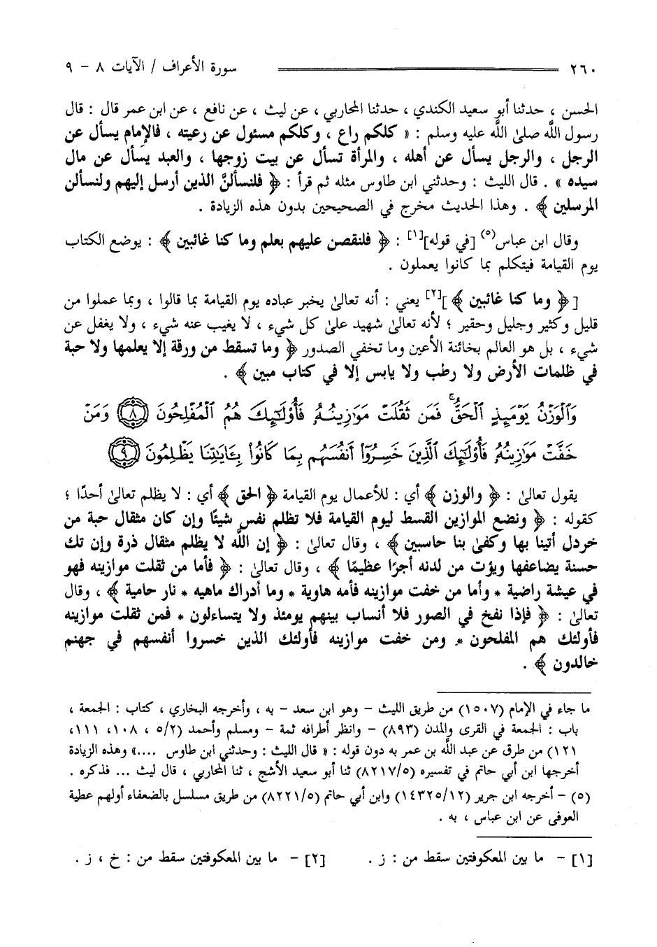 قَالَ اِبْن عَبَّاس فِي قَوْله " فَلَنَقُصَّنَّ عَلَيْهِمْ بِعِلْمٍ وَمَا كُنَّا غَائِبِينَ " يُوضَع الْكِتَاب يَوْم الْقِيَامَة فَيَتَكَلَّم بِمَا كَانُوا يَعْمَلُونَ " وَمَا كُنَّا غَائِبِينَ " يَعْنِي أَنَّهُ تَعَالَى يُخْبِر عِبَاده يَوْم الْقِيَامَة بِمَا قَالُوا وَبِمَا عَمِلُوا مِنْ قَلِيل وَكَثِير وَجَلِيل وَحَقِير لِأَنَّهُ تَعَالَى الشَّهِيد عَلَى كُلّ شَيْء لَا يَغِيب عَنْهُ شَيْء وَلَا يَغْفُل عَنْ شَيْء بَلْ هُوَ الْعَالِم بِخَائِنَةِ الْأَعْيُن وَمَا تُخْفِي الصُّدُور" وَمَا تَسْقُط مِنْ وَرَقَة إِلَّا يَعْلَمهَا وَلَا حَبَّة فِي ظُلُمَات الْأَرْض وَلَا رَطْب وَلَا يَابِس إِلَّا فِي كِتَاب مُبِين " .