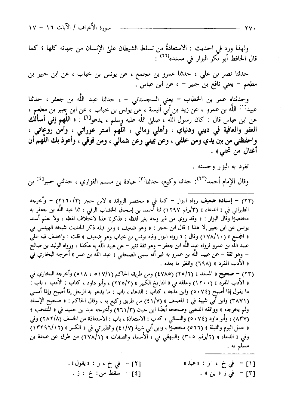 وَلِهَذَا وَرَدَ فِي الْحَدِيث الِاسْتِعَاذَة مِنْ تَسَلُّط الشَّيْطَان عَلَى الْإِنْسَان مِنْ جِهَاته كُلّهَا كَمَا قَالَ الْحَافِظ أَبُو بَكْر الْبَزَّار فِي مُسْنَده حَدَّثَنَا نَصْر بْن عَلِيّ حَدَّثَنَا عَمْرو بْن مُجَمِّع عَنْ يُونُس بْن خَبَّاب عَنْ اِبْن جُبَيْر بْن مُطْعِم يَعْنِي نَافِع بْن جُبَيْر عَنْ اِبْن عَبَّاس وَحَدَّثَنَا عُمَر بْن الْخَطَّاب يَعْنِي السِّجِسْتَانِيّ حَدَّثَنَا عَبْد اللَّه بْن جَعْفَر حَدَّثَنَا عَبْد اللَّه بْن عَمْرو عَنْ زَيْد بْن أَبِي أُنَيْسَةَ عَنْ يُونُس بْن خَبَّاب عَنْ اِبْن جُبَيْر بْن مُطْعِم عَنْ اِبْن عَبَّاس قَالَ كَانَ رَسُول اللَّه صَلَّى اللَّه عَلَيْهِ وَسَلَّمَ يَدْعُو " اللَّهُمَّ إِنِّي أَسْأَلك الْعَفْو وَالْعَافِيَة فِي دِينِي وَدُنْيَايَ وَأَهْلِي وَمَالِي اللَّهُمَّ اُسْتُرْ عَوْرَاتِي وَآمِنْ رَوْعَاتِي وَاحْفَظْنِي مِنْ بَيْن يَدَيَّ وَمِنْ خَلْفِي وَعَنْ يَمِينِي وَعَنْ شِمَالِي وَمِنْ فَوْقِي وَأَعُوذ بِك اللَّهُمَّ أَنْ أُغْتَال مِنْ تَحْتِي " تَفَرَّدَ بِهِ الْبَزَّار وَحَسَّنَهُ وَقَالَ الْإِمَام أَحْمَد حَدَّثَنَا وَكِيع حَدَّثَنَا عُبَادَة بْن مُسْلِم الْفَزَارِيّ حَدَّثَنِي جَرِير بْن