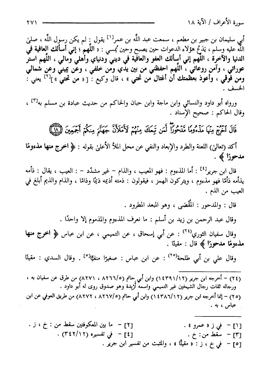 قَالَ وَالْمَدْحُور الْمَقْصِيّ وَهُوَ الْمُبْعَد الْمَطْرُود وَقَالَ عَبْد الرَّحْمَن بْن زَيْد بْن أَسْلَمَ مَا نَعْرِف الْمَذْءُوم وَالْمَذْمُوم إِلَّا وَاحِدًا وَقَالَ سُفْيَان الثَّوْرِيّ عَنْ أَبِي إِسْحَاق عَنْ التَّمِيمِيّ عَنْ اِبْن عَبَّاس " اُخْرُجْ مِنْهَا مَذْءُومًا مَدْحُورًا " قَالَ مَقِيتًا وَقَالَ عَلِيّ بْن أَبِي طَلْحَة عَنْ اِبْن عَبَّاس صَغِيرًا مَقِيتًا وَقَالَ السُّدِّيّ مَقِيتًا