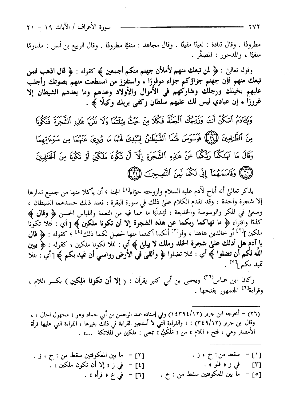 عِنْد ذَلِكَ حَسَدَهُمَا الشَّيْطَان وَسَعَى فِي الْمَكْر وَالْوَسْوَسَة وَالْخَدِيعَة لِيَسْلُبهُمَا مَا هُمَا فِيهِ مِنْ النِّعْمَة وَاللِّبَاس الْحَسَن وَقَالَ كَذِبًا وَافْتِرَاء " مَا نَهَاكُمَا رَبّكُمَا عَنْ هَذِهِ الشَّجَرَة إِلَّا أَنْ تَكُونَا مَلَكَيْنِ " أَيْ لِئَلَّا تَكُونَا مَلَكَيْنِ أَوْ خَالِدَيْنِ هَاهُنَا وَلَوْ أَنَّكُمَا أَكَلْتُمَا مِنْهَا لَحَصَلَ لَكُمَا ذَلِكُمَا كَقَوْلِهِ " قَالَ يَا آدَم هَلْ أَدُلّك عَلَى شَجَرَة الْخُلْد وَمُلْك لَا يَبْلَى " أَيْ لِئَلَّا تَكُونَا مَلَكَيْنِ كَقَوْلِهِ " يُبَيِّن اللَّه لَكُمْ أَنْ تَضِلُّوا" أَيْ لِئَلَّا تَضِلُّوا " وَأَلْقَى فِي الْأَرْض رَوَاسِي أَنْ تَمِيد بِكُمْ " أَيْ لِئَلَّا تَمِيد بِكُمْ .