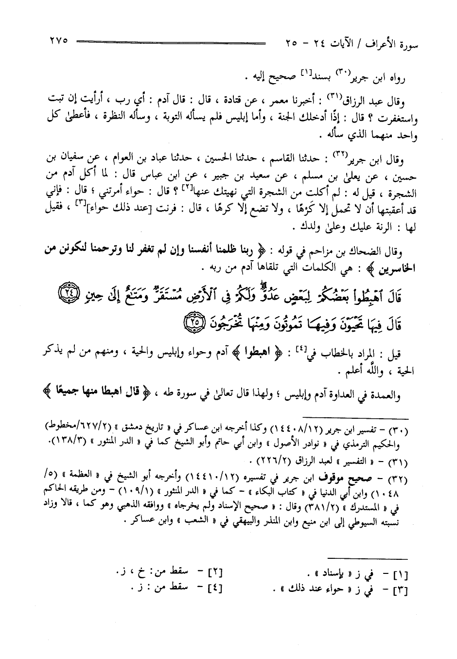 رَوَاهُ اِبْن جَرِير بِسَنَدٍ صَحِيح إِلَيْهِ وَقَالَ عَبْد الرَّزَّاق أَخْبَرَنَا مَعْمَر عَنْ قَتَادَة قَالَ : قَالَ آدَم أَيْ رَبّ أَرَأَيْت إِنْ تُبْت وَاسْتَغْفَرْت قَالَ : إِذًا أُدْخِلك الْجَنَّة وَأَمَّا إِبْلِيس فَلَمْ يَسْأَلهُ التَّوْبَة وَسَأَلَهُ النَّظِرَة فَأُعْطِيَ كُلّ وَاحِد مِنْهُمَا الَّذِي سَأَلَهُ وَقَالَ اِبْن جَرِير حَدَّثَنَا الْقَاسِم حَدَّثَنَا الْحُسَيْن حَدَّثَنَا عَبَّاد بْن الْعَوَّام عَنْ سُفْيَان بْن حُسَيْن عَنْ يَعْلَى بْن مُسْلِم عَنْ سَعِيد بْن جُبَيْر عَنْ اِبْن عَبَّاس قَالَ لَمَّا أَكَلَ آدَم مِنْ الشَّجَرَة قِيلَ لَهُ لِمَ أَكَلْت مِنْ الشَّجَرَة الَّتِي نَهَيْتُك عَنْهَا ؟ قَالَ : حَوَّاء أَمَرَتْنِي قَالَ : فَإِنِّي قَدْ أَعْقَبْتهَا أَنْ لَا تَحْمِل إِلَّا كُرْهًا وَلَا تَضَع إِلَّا كُرْهًا قَالَ فَرَنَّتْ عِنْد ذَلِكَ حَوَّاء فَقِيلَ لَهَا الرَّنَّة عَلَيْك وَعَلَى وَلَدك .
