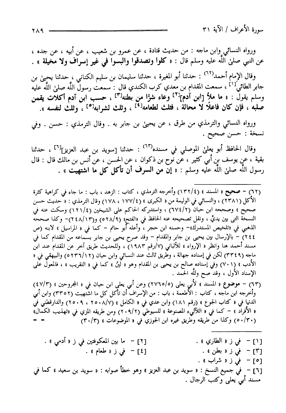 وَرَوَاهُ النَّسَائِيّ وَابْن مَاجَهْ مِنْ حَدِيث قَتَادَة عَنْ عَمْرو بْن شُعَيْب عَنْ أَبِيهِ عَنْ جَدّه عَنْ النَّبِيّ صَلَّى اللَّه عَلَيْهِ وَسَلَّمَ قَالَ " كُلُوا وَتَصَدَّقُوا وَالْبَسُوا فِي غَيْر إِسْرَاف وَلَا مَخِيلَة" وَقَالَ الْإِمَام أَحْمَد حَدَّثَنَا أَبُو الْمُغِيرَة حَدَّثَنَا سُلَيْمَان بْن سُلَيْم الْكَلْبِيّ حَدَّثَنَا يَحْيَى بْن جَابِر الطَّائِيّ سَمِعْت الْمِقْدَام بْن مَعْدِي كَرِبَ الْكِنْدِيّ قَالَ : سَمِعْت رَسُول اللَّه صَلَّى اللَّه عَلَيْهِ وَسَلَّمَ يَقُول " مَا مَلَأَ اِبْن آدَم وِعَاء شَرًّا مِنْ بَطْنه حَسْب اِبْن آدَم أَكَلَات يُقِمْنَ صُلْبه فَإِنْ كَانَ فَاعِلًا لَا مَحَالَة فَثُلُث لِطَعَامِهِ وَثُلُث لِشَرَابِهِ وَثُلُث لِنَفَسِهِ " وَرَوَاهُ النَّسَائِيّ وَالتِّرْمِذِيّ مِنْ طُرُق عَنْ يَحْيَى بْن جَابِر بِهِ وَقَالَ التِّرْمِذِيّ حَسَن وَفِي نُسْخَة حَسَن صَحِيح وَقَالَ الْحَافِظ أَبُو يَعْلَى الْمَوْصِلِيّ فِي مُسْنَده حَدَّثَنَا سُوَيْد بْن عَبْد الْعَزِيز حَدَّثَنَا بَقِيَّة عَنْ يُوسُف بْن أَبِي كَثِير عَنْ نُوح بْن ذَكْوَان عَنْ الْحَسَن عَنْ أَنَس بْن مَالِك قَالَ : قَالَ رَسُول اللَّه صَلَّى اللَّه عَلَيْهِ وَسَلَّمَ " إِنَّ مِنْ السَّرَف أَنْ تَأْكُل كُلّ مَا اِشْتَهَيْت" .