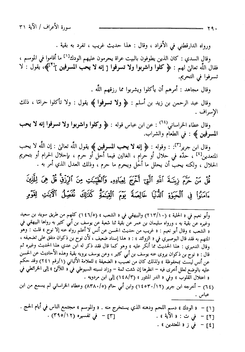 وَرَوَاهُ الدَّارَقُطْنِيّ فِي الْأَفْرَاد وَقَالَ هَذَا حَدِيث غَرِيب تَفَرَّدَ بِهِ بَقِيَّة وَقَالَ السُّدِّيّ كَانَ الَّذِينَ يَطُوفُونَ بِالْبَيْتِ عُرَاة يُحَرِّمُونَ عَلَيْهِمْ الْوَدَك مَا أَقَامُوا فِي الْمَوْسِم فَقَالَ اللَّه تَعَالَى لَهُمْ " كُلُوا وَاشْرَبُوا" الْآيَة .