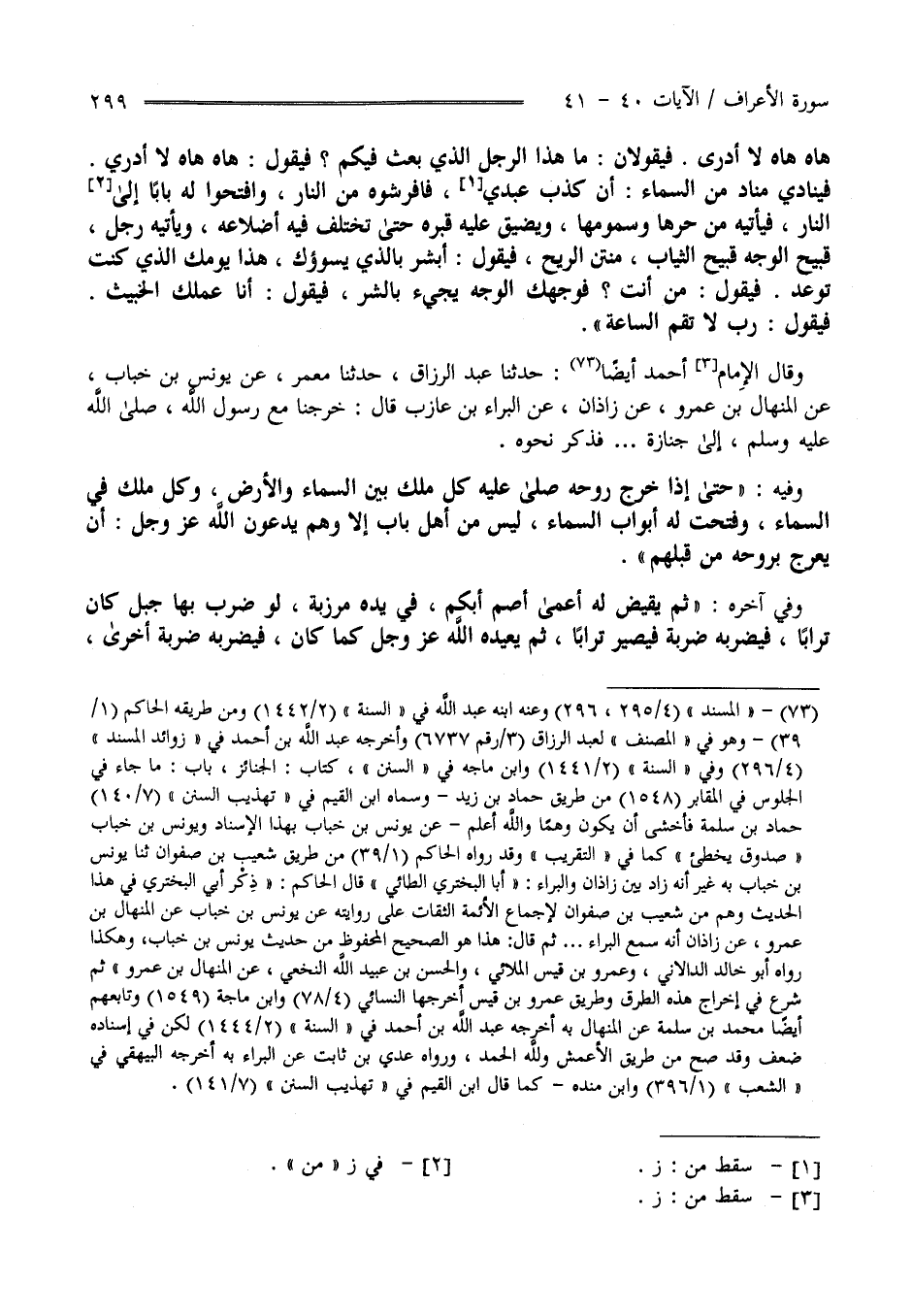 هَاهْ هَاهْ لَا أَدْرِي فَيَقُولَانِ مَا هَذَا الرَّجُل الَّذِي بُعِثَ فِيكُمْ فَيَقُول هَاهْ هَاهْ لَا أَدْرِي فَيُنَادِي مُنَادٍ مِنْ السَّمَاء أَنْ كَذَبَ عَبْدِي فَأَفْرِشُوهُ مِنْ النَّار وَافْتَحُوا لَهُ بَابًا إِلَى النَّار فَيَأْتِيه مِنْ حَرّهَا وَسَمُومهَا وَيُضَيَّق عَلَيْهِ قَبْره حَتَّى تَخْتَلِف فِيهِ أَضْلَاعه وَيَأْتِيه رَجُل قَبِيح الْوَجْه قَبِيح الثِّيَاب مُنْتِن الرِّيح فَيَقُول أَبْشِرْ بِاَلَّذِي يَسُوءك هَذَا يَوْمك الَّذِي كُنْت تُوعَد فَيَقُول مَنْ أَنْتَ فَوَجْهك الْوَجْه يَجِيء بِالشَّرِّ فَيَقُول أَنَا عَمَلك الْخَبِيث فَيَقُول رَبّ لَا تُقِمْ السَّاعَة " وَقَالَ الْإِمَام أَحْمَد أَيْضًا حَدَّثَنَا عَبْد الرَّزَّاق حَدَّثَنَا مَعْمَر عَنْ يُونُس بْن خَبَّاب عَنْ الْمِنْهَال بْن عَمْرو عَنْ زَاذَان عَنْ الْبَرَاء بْن عَازِب قَالَ : خَرَجْنَا مَعَ رَسُول اللَّه صَلَّى اللَّه عَلَيْهِ وَسَلَّمَ إِلَى جِنَازَة فَذَكَرَ نَحْوه وَفِيهِ حَتَّى إِذَا خَرَجَ رُوحه صَلَّى عَلَيْهِ كُلّ مَلَك مِنْ السَّمَاء وَالْأَرْض وَكُلّ مَلَك فِي السَّمَاء وَفُتِحَتْ لَهُ أَبْوَاب السَّمَاء لَيْسَ مِنْ أَهْل بَاب إِلَّا وَهُمْ يَدْعُونَ اللَّه عَزَّ وَجَلَّ أَنْ يُعْرَج بِرُوحِهِ مِنْ قِبَلهمْ وَفِي آخِره ثُمَّ يُقَيَّض لَهُ أَعْمَى أَصَمّ أَبْكَم فِي يَده مِرْزَبَّة لَوْ ضُرِبَ بِهَا جَبَل كَانَ تُرَابًا فَيَضْرِبهُ ضَرْبَة فَيَصِير تُرَابًا ثُمَّ يُعِيدهُ اللَّه عَزَّ وَجَلَّ كَمَا كَانَ فَيَضْرِبهُ ضَرْبَة أُخْرَى