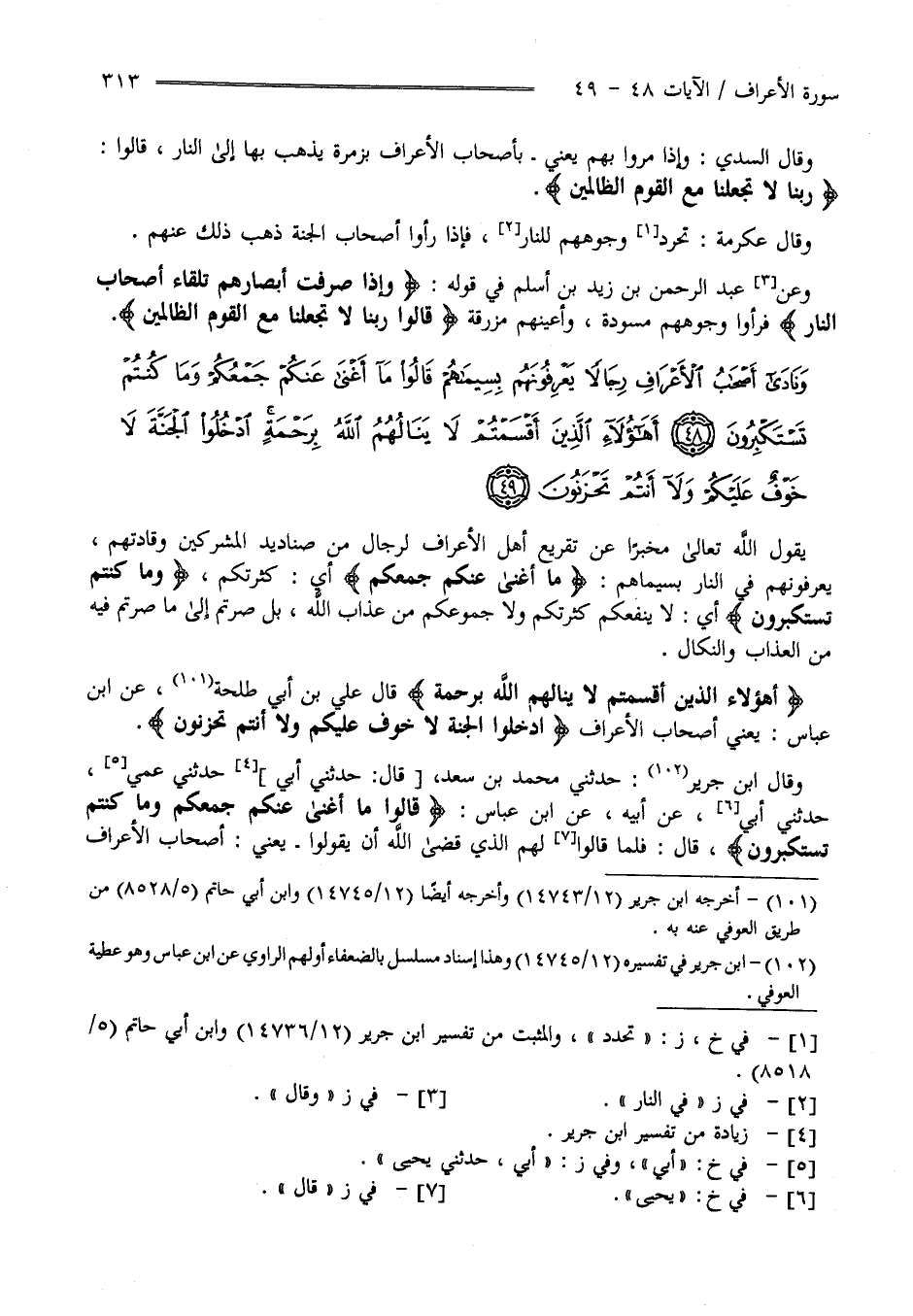 " أَهَؤُلَاءِ الَّذِينَ أَقْسَمْتُمْ لَا يَنَالهُمْ اللَّه بِرَحْمَةٍ" قَالَ عَلِيّ بْن أَبِي طَلْحَة عَنْ اِبْن عَبَّاس يَعْنِي أَصْحَاب الْأَعْرَاف " اُدْخُلُوا الْجَنَّة لَا خَوْف عَلَيْكُمْ وَلَا أَنْتُمْ تَحْزَنُونَ " وَقَالَ اِبْن جَرِير حَدَّثَنِي مُحَمَّد بْن سَعْد حَدَّثَنِي أَبِي حَدَّثَنِي عَمِّي حَدَّثَنِي أَبِي عَنْ أَبِيهِ عَنْ اِبْن عَبَّاس" قَالُوا مَا أَغْنَى عَنْكُمْ جَمْعكُمْ " الْآيَة .