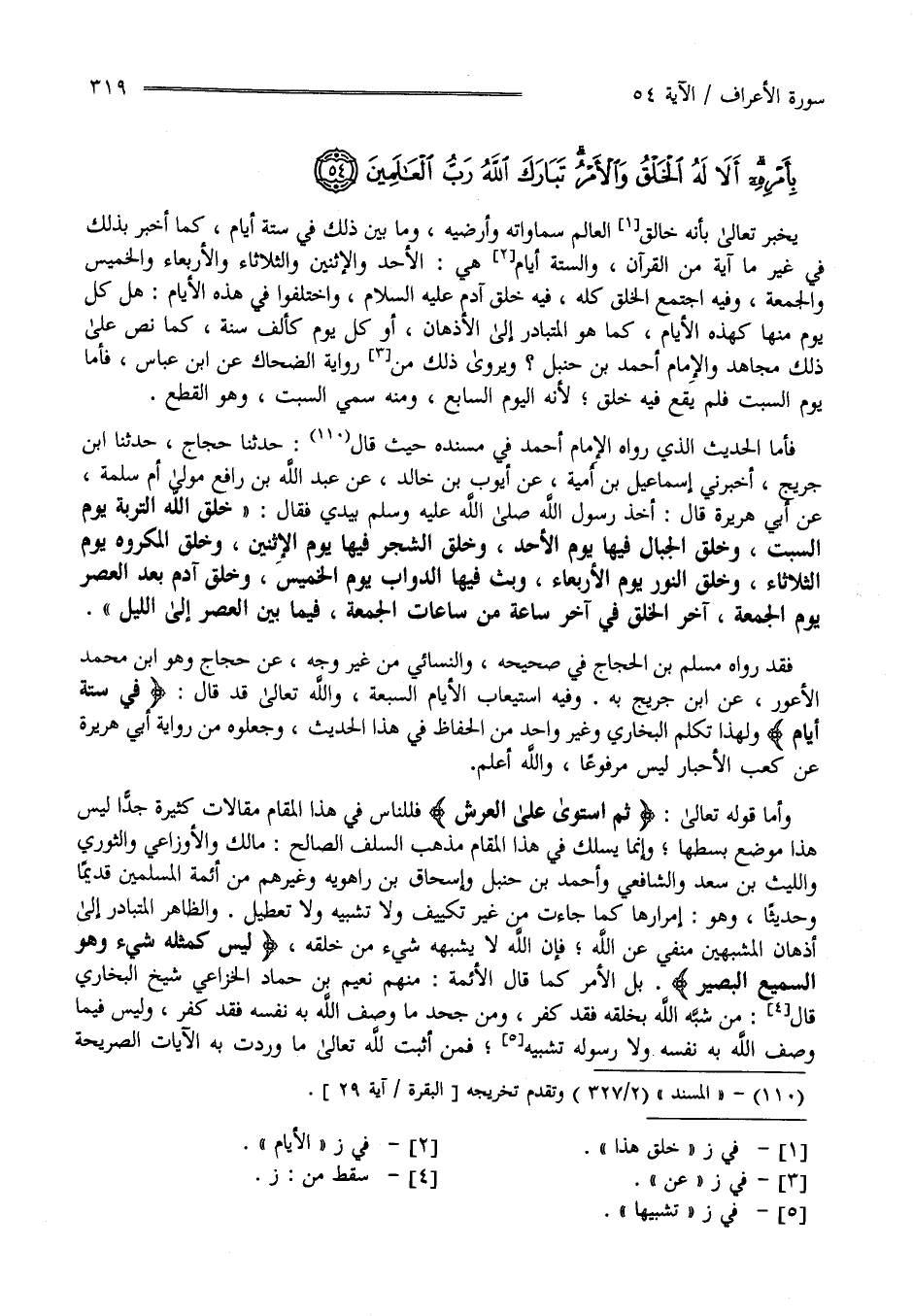 وَأَمَّا قَوْله تَعَالَى " ثُمَّ اِسْتَوَى عَلَى الْعَرْش " فَلِلنَّاسِ فِي هَذَا الْمَقَام مَقَالَات كَثِيرَة جِدًّا لَيْسَ هَذَا مَوْضِع بَسْطهَا وَإِنَّمَا نَسْلك فِي هَذَا الْمَقَام مَذْهَب السَّلَف الصَّالِح مَالِك وَالْأَوْزَاعِيّ وَالثَّوْرِيّ وَاللَّيْث بْن سَعْد وَالشَّافِعِيّ وَأَحْمَد وَإِسْحَاق بْن رَاهْوَيْهِ وَغَيْرهمْ مِنْ أَئِمَّة الْمُسْلِمِينَ قَدِيمًا وَحَدِيثًا وَهُوَ إِمْرَارهَا كَمَا جَاءَتْ مِنْ غَيْر تَكْيِيف وَلَا تَشْبِيه وَلَا تَعْطِيل وَالظَّاهِر الْمُتَبَادِر إِلَى أَذْهَان الْمُشَبِّهِينَ مَنْفِيّ عَنْ اللَّه فَإِنَّ اللَّه لَا يُشْبِههُ شَيْء مِنْ خَلْقه وَ " لَيْسَ كَمِثْلِهِ شَيْء وَهُوَ السَّمِيع الْبَصِير " بَلْ الْأَمْر كَمَا قَالَ الْأَئِمَّة مِنْهُمْ نُعَيْم بْن حَمَّاد الْخُزَاعِيّ شَيْخ الْبُخَارِيّ قَالَ مَنْ شَبَّهَ اللَّه بِخَلْقِهِ كَفَرَ وَمَنْ جَحَدَ مَا وَصَفَ اللَّه بِهِ نَفْسه فَقَدْ كَفَرَ وَلَيْسَ فِيمَا وَصَفَ اللَّه بِهِ نَفْسه وَلَا رَسُوله تَشْبِيه فَمَنْ أَثْبَتَ لِلَّهِ تَعَالَى مَا وَرَدَتْ بِهِ الْآيَات