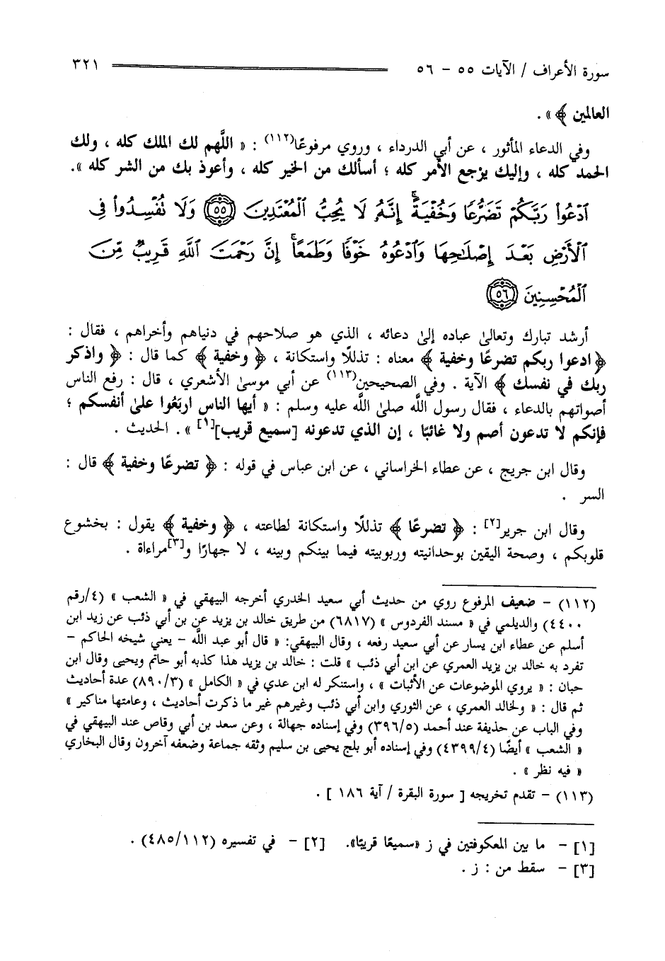 وَفِي الصَّحِيحَيْنِ عَنْ أَبِي مُوسَى الْأَشْعَرِيّ قَالَ : رَفَعَ النَّاس أَصْوَاتهمْ بِالدُّعَاءِ فَقَالَ رَسُول اللَّه صَلَّى اللَّه عَلَيْهِ وَسَلَّمَ " أَيّهَا النَّاس اِرْبَعُوا عَلَى أَنْفُسكُمْ فَإِنَّكُمْ لَا تَدْعُونَ أَصَمّ وَلَا غَائِبًا إِنَّ الَّذِي تَدْعُونَ سَمِيع قَرِيب " الْحَدِيث وَقَالَ اِبْن جُرَيْج عَنْ عَطَاء الْخُرَاسَانِيّ عَنْ اِبْن عَبَّاس فِي قَوْله" تَضَرُّعًا وَخُفْيَة " قَالَ السِّرّ وَقَالَ اِبْن جَرِير تَضَرُّعًا تَذَلُّلًا وَاسْتِكَانَة لِطَاعَتِهِ وَخُفْيَة يَقُول بِخُشُوعِ قُلُوبكُمْ وَصِحَّة الْيَقِين بِوَحْدَانِيّته وَرُبُوبِيَّته فِيمَا بَيْنكُمْ وَبَيْنه لَا جِهَارًا مُرَاءَاة