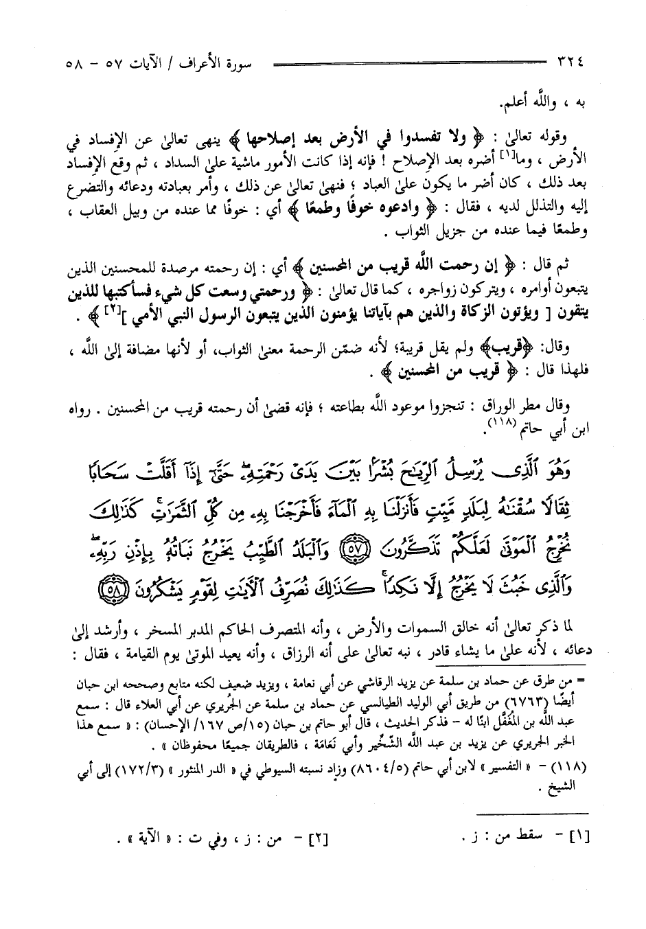 قَوْله تَعَالَى " وَلَا تُفْسِدُوا فِي الْأَرْض بَعْد إِصْلَاحهَا " يَنْهَى تَعَالَى عَنْ الْإِفْسَاد فِي الْأَرْض وَمَا أَضَرَّهُ بَعْد الْإِصْلَاح فَإِنَّهُ إِذَا كَانَتْ الْأُمُور مَاشِيَة عَلَى السَّدَاد ثُمَّ وَقَعَ الْإِفْسَاد بَعْد ذَلِكَ كَانَ أَضَرّ مَا يَكُون عَلَى الْعِبَاد فَنَهَى تَعَالَى عَنْ ذَلِكَ وَأَمَرَ بِعِبَادَتِهِ وَدُعَائِهِ وَالتَّضَرُّع إِلَيْهِ وَالتَّذَلُّل لَدَيْهِ فَقَالَ " وَادْعُوهُ خَوْفًا وَطَمَعًا" أَيْ خَوْفًا مِمَّا عِنْده مِنْ وَبِيل الْعِقَاب وَطَمَعًا فِيمَا عِنْده مِنْ جَزِيل الثَّوَاب ثُمَّ قَالَ " إِنَّ رَحْمَة اللَّه قَرِيب مِنْ الْمُحْسِنِينَ " أَيْ إِنَّ رَحْمَته مُرْصَدَة لِلْمُحْسِنِينَ الَّذِينَ يَتَّبِعُونَ أَوَامِره وَيَتْرُكُونَ زَوَاجِره كَمَا قَالَ تَعَالَى " وَرَحْمَتِي وَسِعَتْ كُلّ شَيْء فَسَأَكْتُبُهَا لِلَّذِينَ يَتَّقُونَ " الْآيَة .