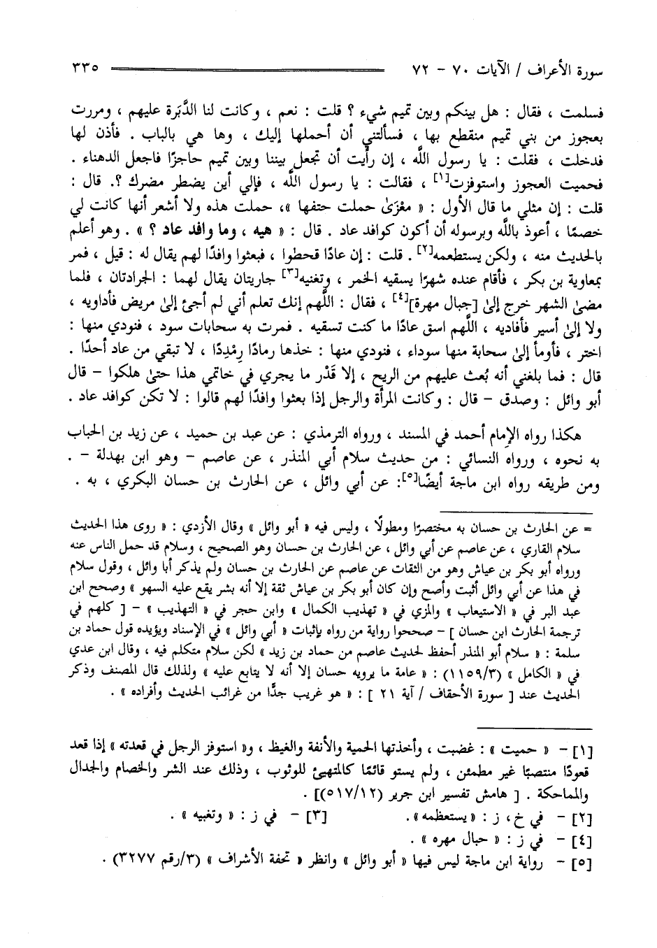 وَسَلَّمْت فَقَالَ هَلْ بَيْنكُمْ وَبَيْن تَمِيم شَيْء قُلْت نَعَمْ وَكَانَتْ لَنَا الدَّائِرَة عَلَيْهِمْ وَمَرَرْت بِعَجُوزٍ مِنْ بَنِي تَمِيم مُنْقَطِع بِهَا فَسَأَلَتْنِي أَنْ أَحْمِلهَا إِلَيْك وَهَا هِيَ بِالْبَابِ فَأَذِنَ لَهَا فَدَخَلَتْ فَقُلْت يَا رَسُول اللَّه إِنْ رَأَيْت أَنْ تَجْعَل بَيْننَا وَبَيْن تَمِيم حَاجِزًا فَاجْعَلْ الدَّهْنَاء فَحَمِيَتْ الْعَجُوز وَاسْتَوْفَزْت وَقَالَتْ يَا رَسُول اللَّه فَإِلَى أَيْنَ يُضْطَرّ مُضْطَرّك قَالَ قُلْت : إِنَّ مَثَلِي مَثَل مَا قَالَ الْأَوَّل : " مِعْزَى حَمَلَتْ حَتْفهَا" حَمَلْت هَذِهِ وَلَا أَشْعُر أَنَّهَا كَانَتْ لِي خَصْمًا أَعُوذ بِاَللَّهِ وَبِرَسُولِهِ أَنْ أَكُون كَوَافِدِ عَاد قَالَ لِي " وَمَا وَافِد عَاد " ؟ وَهُوَ أَعْلَم بِالْحَدِيثِ مِنْهُ وَلَكِنْ يَسْتَطْعِمهُ قُلْت إِنْ عَادًا قَحَطُوا فَبَعَثُوا وَافِدًا لَهُمْ يُقَال لَهُ قَيْل فَمَرَّ بِمُعَاوِيَة بْن بَكْر فَأَقَامَ عِنْده شَهْرًا يَسْقِيه الْخَمْر وَتُغَنِّيه جَارِيَتَانِ يُقَال لَهُمَا الْجَرَادَتَانِ فَلَمَّا مَضَى الشَّهْر خَرَجَ إِلَى جِبَال مُهْرَة فَقَالَ اللَّهُمَّ إِنَّك تَعْلَم أَنِّي لَمْ أَجِئْ إِلَى مَرِيض فَأُدَاوِيه وَلَا إِلَى أَسِير فَأُفَادِيهِ .