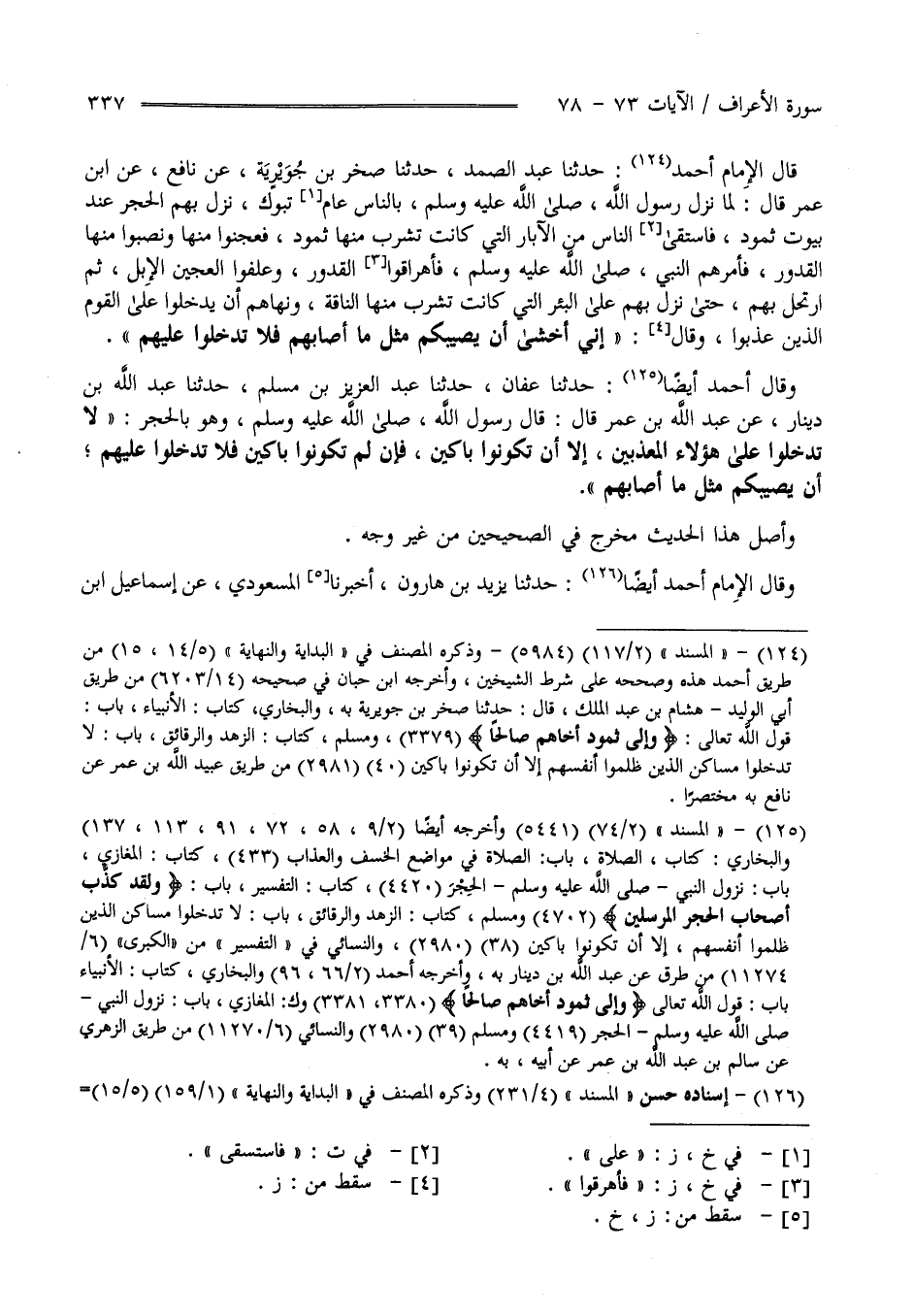 قَالَ الْإِمَام أَحْمَد حَدَّثَنَا عَبْد الصَّمَد حَدَّثَنَا صَخْر بْن جُوَيْرِيَة عَنْ نَافِع عَنْ اِبْن عُمَر قَالَ لَمَّا نَزَلَ رَسُول اللَّه صَلَّى اللَّه عَلَيْهِ وَسَلَّمَ بِالنَّاسِ عَلَى تَبُوك نَزَلَ بِهِمْ الْحِجْر عِنْد بُيُوت ثَمُود فَاسْتَقَى النَّاس مِنْ الْآبَار الَّتِي كَانَتْ تَشْرَب مِنْهَا ثَمُود فَعَجَنُوا مِنْهَا وَنَصَبُوا لَهَا الْقُدُور فَأَمَرَهُمْ النَّبِيّ صَلَّى اللَّه عَلَيْهِ وَسَلَّمَ فَأَهْرَقُوا الْقُدُور وَعَلَفُوا الْعَجِين الْإِبِل ثُمَّ اِرْتَحَلَ بِهِمْ حَتَّى نَزَلَ بِهِمْ عَلَى الْبِئْر الَّتِي كَانَتْ تَشْرَب مِنْهَا النَّاقَة وَنَهَاهُمْ أَنْ يَدْخُلُوا عَلَى الْقَوْم الَّذِينَ عُذِّبُوا وَقَالَ " إِنِّي أَخْشَى أَنْ يُصِيبكُمْ مِثْل مَا أَصَابَهُمْ فَلَا تَدْخُلُوا عَلَيْهِمْ " وَقَالَ أَحْمَد أَيْضًا حَدَّثَنَا عَفَّان حَدَّثَنَا عَبْد الْعَزِيز بْن مُسْلِم حَدَّثَنَا عَبْد اللَّه بْن دِينَار عَنْ عَبْد اللَّه بْن عُمَر قَالَ : قَالَ رَسُول اللَّه صَلَّى اللَّه عَلَيْهِ وَسَلَّمَ وَهُوَ بِالْحِجْرِ " لَا تَدْخُلُوا عَلَى هَؤُلَاءِ الْمُعَذَّبِينَ إِلَّا أَنْ تَكُونُوا بَاكِينَ فَإِنْ لَمْ تَكُونُوا بَاكِينَ فَلَا تَدْخُلُوا عَلَيْهِمْ أَنْ يُصِيبكُمْ مِثْل مَا أَصَابَهُمْ " وَأَصْل هَذَا الْحَدِيث مُخَرَّج فِي الصَّحِيحَيْنِ مِنْ غَيْر وَجْه وَقَالَ الْإِمَام أَحْمَد أَيْضًا حَدَّثَنَا يَزِيد بْن هَارُون الْمَسْعُودِيّ عَنْ إِسْمَاعِيل بْن