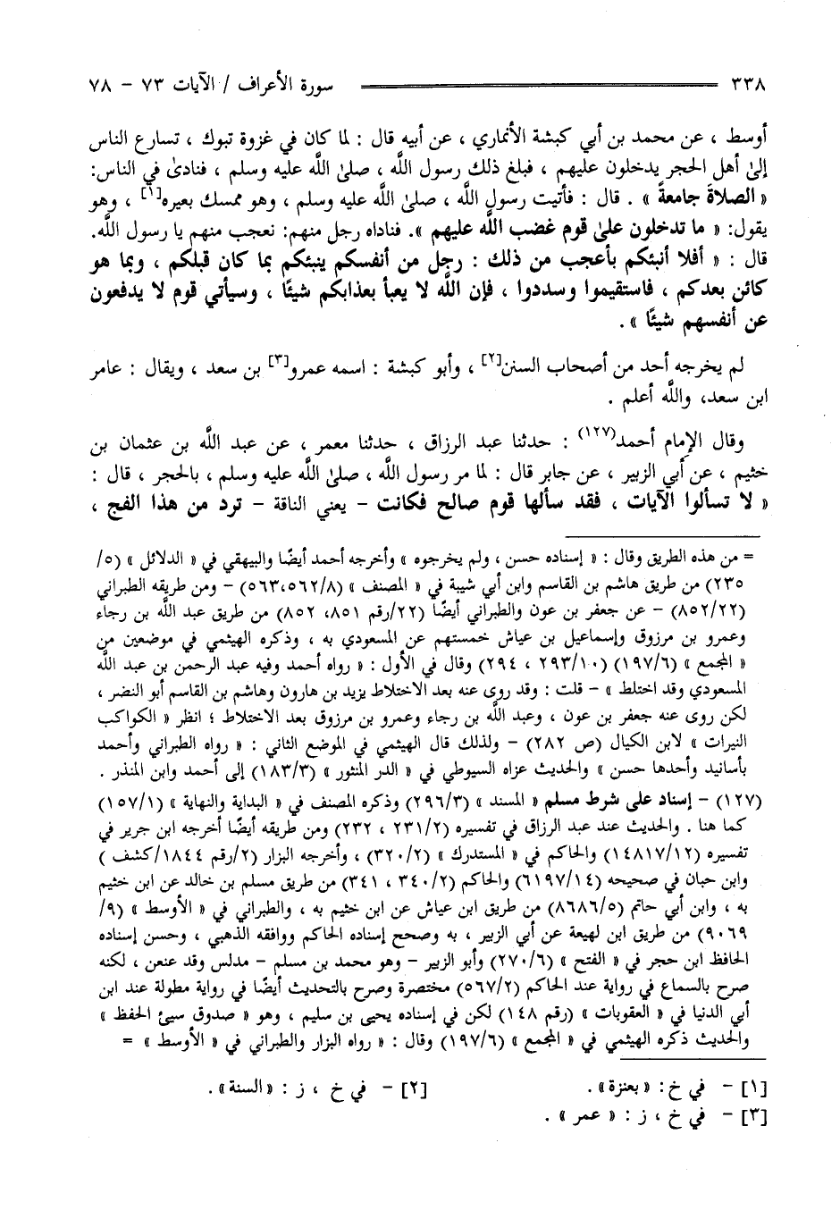أَوْسَط عَنْ مُحَمَّد بْن أَبِي كَبْشَة الْأَنْمَارِيّ عَنْ أَبِيهِ قَالَ لَمَّا كَانَ فِي غَزْوَة تَبُوك تَسَارَعَ النَّاس إِلَى أَهْل الْحِجْر يَدْخُلُونَ عَلَيْهِمْ فَبَلَغَ ذَلِكَ رَسُول اللَّه صَلَّى اللَّه عَلَيْهِ وَسَلَّمَ فَنَادَى فِي النَّاس " الصَّلَاة جَامِعَة " قَالَ فَأَتَيْت رَسُول اللَّه صَلَّى اللَّه عَلَيْهِ وَسَلَّمَ وَهُوَ مُمْسِك بِعَنَزَةٍ وَهُوَ يَقُول " مَا تَدْخُلُونَ عَلَى قَوْم غَضِبَ اللَّه عَلَيْهِمْ" فَنَادَاهُ رَجُل مِنْهُمْ نَعْجَب مِنْهُمْ يَا رَسُول اللَّه ؟ قَالَ" أَفَلَا أُنَبِّئكُمْ بِأَعْجَب مِنْ ذَلِكَ : رَجُل مِنْ أَنْفُسكُمْ يُنَبِّئكُمْ بِمَا كَانَ قَبْلكُمْ وَبِمَا هُوَ كَائِن بَعْدكُمْ فَاسْتَقِيمُوا وَسَدِّدُوا فَإِنَّ اللَّه لَا يَعْبَأ بِعَذَابِكُمْ شَيْئًا وَسَيَأْتِي قَوْم لَا يَدْفَعُونَ عَنْ أَنْفُسهمْ شَيْئًا " لَمْ يُخَرِّجهُ أَحَد مِنْ أَصْحَاب السُّنَن وَأَبُو كَبْشَة اِسْمه عُمَر بْن سَعْد وَيُقَال عَامِر بْن سَعْد وَاَللَّه أَعْلَم .