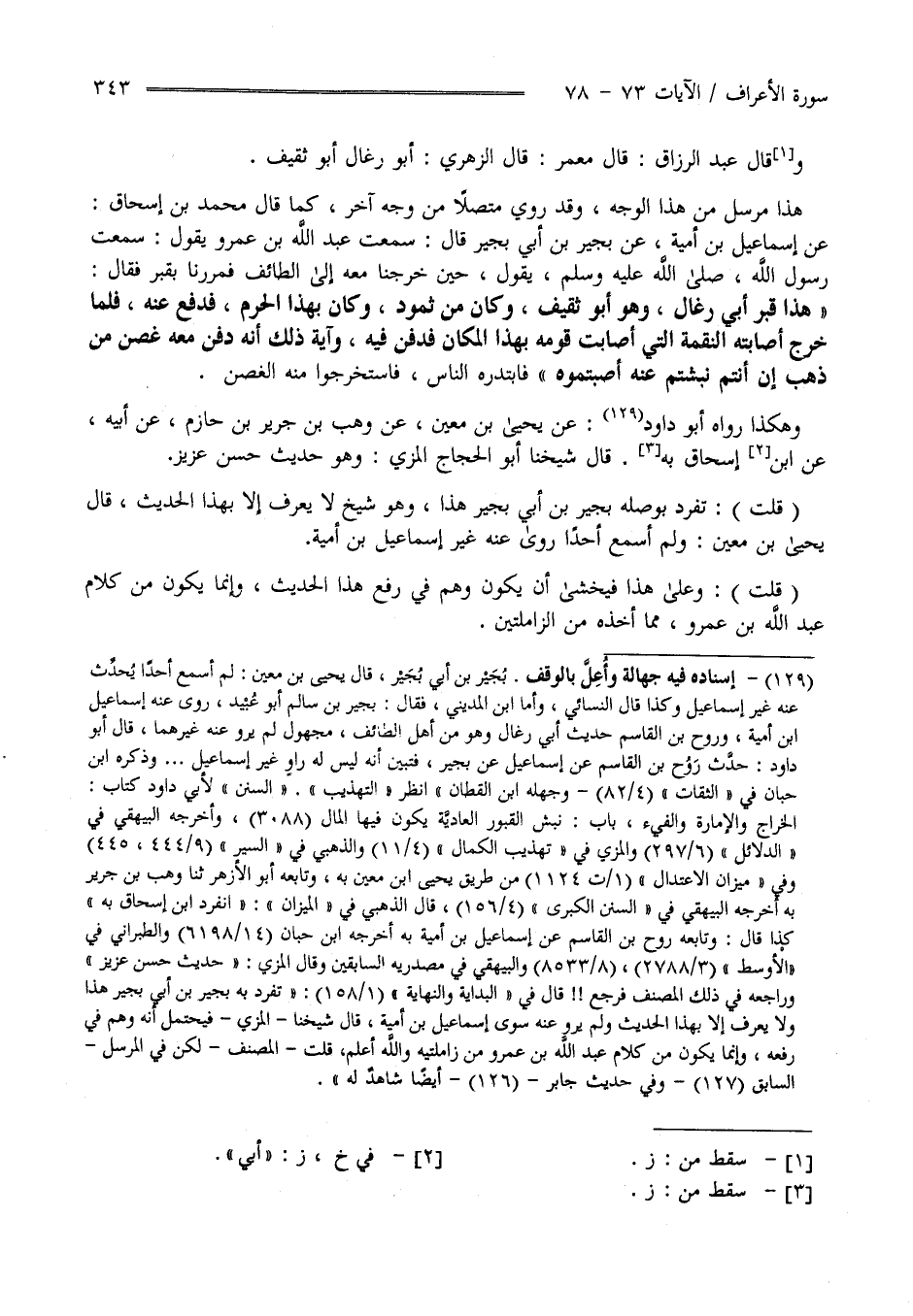 وَقَالَ عَبْد الرَّزَّاق قَالَ مَعْمَر قَالَ الزُّهْرِيّ أَبُو رِغَال أَبُو ثَقِيف هَذَا مُرْسَل مِنْ هَذَا الْوَجْه وَقَدْ رُوِيَ مُتَّصِلًا مِنْ وَجْه آخَر كَمَا قَالَ مُحَمَّد بْن إِسْحَاق عَنْ إِسْمَاعِيل بْن أُمَيَّة عَنْ بُجَيْر بْن أَبِي بُجَيْر قَالَ سَمِعْت عَبْد اللَّه بْن عَمْرو يَقُول سَمِعْت رَسُول اللَّه صَلَّى اللَّه عَلَيْهِ وَسَلَّمَ وَآله يَقُول حِين خَرَجْنَا مَعَهُ إِلَى الطَّائِف فَمَرَرْنَا بِقَبْرٍ فَقَالَ " هَذَا قَبْر أَبِي رِغَال وَهُوَ أَبُو ثَقِيف وَكَانَ مِنْ ثَمُود وَكَانَ بِهَذَا الْحَرَم فَدُفِعَ عَنْهُ فَلَمَّا خَرَجَ أَصَابَتْهُ النِّقْمَة الَّتِي أَصَابَتْ قَوْمه بِهَذَا الْمَكَان فَدُفِنَ فِيهِ وَآيَة ذَلِكَ أَنَّهُ دُفِنَ مَعَهُ غُصْن مِنْ ذَهَب إِنْ أَنْتُمْ نَبَشْتُمْ عَنْهُ أَصَبْتُمُوهُ فَابْتَدَرَهُ النَّاس فَاسْتَخْرَجُوا مِنْهُ الْغُصْن " .