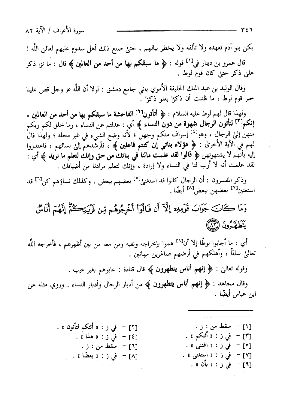 " إِنَّكُمْ لَتَأْتُونَ الرِّجَال شَهْوَة مِنْ دُون النِّسَاء " أَيْ عَدَلْتُمْ عَنْ النِّسَاء وَمَا خَلَقَ لَكُمْ رَبّكُمْ مِنْهُنَّ إِلَى الرِّجَال وَهَذَا إِسْرَاف مِنْكُمْ وَجَهْل لِأَنَّهُ وَضْع الشَّيْء فِي غَيْر مَحَلّه وَلِهَذَا قَالَ لَهُمْ فِي الْآيَة الْأُخْرَى قَالَ " هَؤُلَاءِ بَنَاتِي إِنْ كُنْتُمْ فَاعِلِينَ " فَأَرْشَدَهُمْ إِلَى نِسَائِهِمْ فَاعْتَذَرُوا إِلَيْهِ بِأَنَّهُمْ لَا يَشْتَهُونَهُنَّ " قَالُوا لَقَدْ عَلِمْت مَا لَنَا فِي بَنَاتك مِنْ حَقّ وَإِنَّك لَتَعْلَم مَا نُرِيد " أَيْ لَقَدْ عَلِمْت أَنَّهُ لَا أَرَب لَنَا فِي النِّسَاء وَلَا إِرَادَة وَإِنَّك لَتَعْلَم مُرَادنَا مِنْ أَضْيَافك وَذَكَرَ الْمُفَسِّرُونَ أَنَّ الرِّجَال كَانُوا قَدْ اِسْتَغْنَى بَعْضهمْ بِبَعْضٍ وَكَذَلِكَ نِسَاؤُهُمْ كُنَّ قَدْ اِسْتَغْنَيْنَ بَعْضهنَّ بِبَعْضٍ أَيْضًا .