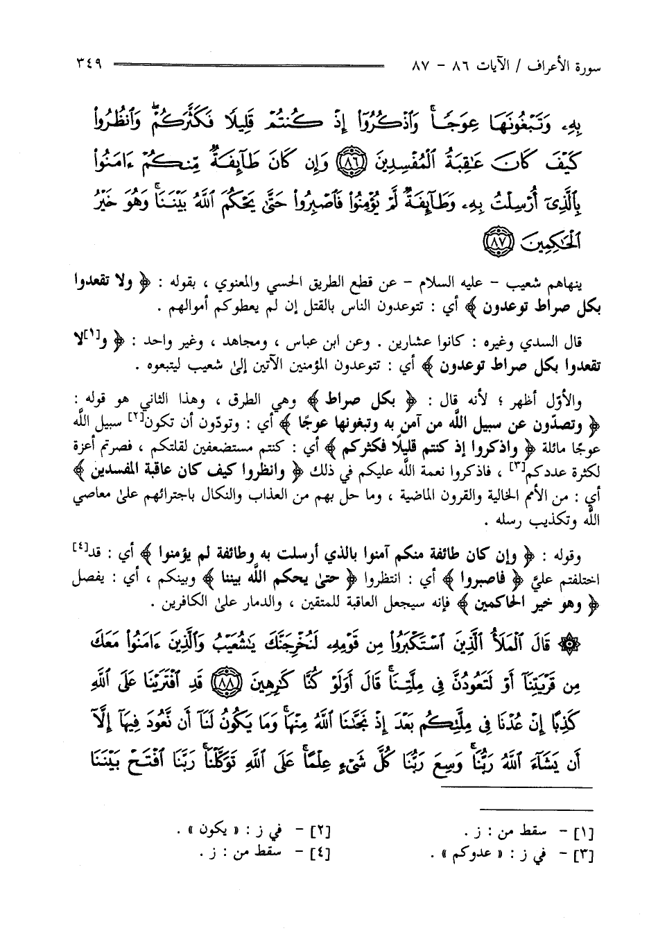 قَالَ السُّدِّيّ وَغَيْره : كَانُوا عَشَّارِينَ وَعَنْ اِبْن عَبَّاس وَمُجَاهِد وَغَيْر وَاحِد " وَلَا تَقْعُدُوا بِكُلِّ صِرَاط تُوعِدُونَ" أَيْ تَتَوَعَّدُونَ الْمُؤْمِنِينَ الْآتِينَ إِلَى شُعَيْب لِيَتَّبِعُوهُ وَالْأَوَّل أَظْهَر لِأَنَّهُ قَالَ " بِكُلِّ صِرَاط " وَهُوَ الطَّرِيق وَهَذَا الثَّانِي هُوَ قَوْله " وَتَصُدُّونَ عَنْ سَبِيل اللَّه مَنْ آمَنَ بِهِ وَتَبْغُونَهَا عِوَجًا " أَيْ وَتَوَدُّونَ أَنْ تَكُون سَبِيل اللَّه عِوَجًا مَائِلَة " وَاذْكُرُوا إِذْ كُنْتُمْ قَلِيلًا فَكَثَّرَكُمْ " أَيْ كُنْتُمْ مُسْتَضْعَفِينَ لِقِلَّتِكُمْ فَصِرْتُمْ أَعِزَّة لِكَثْرَةِ عَدَدكُمْ فَاذْكُرُوا نِعْمَة اللَّه عَلَيْكُمْ فِي ذَلِكَ " وَانْظُرُوا كَيْف كَانَ عَاقِبَة الْمُفْسِدِينَ " أَيْ مِنْ الْأُمَم الْخَالِيَة وَالْقُرُون الْمَاضِيَة وَمَا حَلَّ بِهِمْ مِنْ الْعَذَاب وَالنَّكَال بِاجْتِرَائِهِمْ عَلَى مَعَاصِي اللَّه وَتَكْذِيب رُسُله .