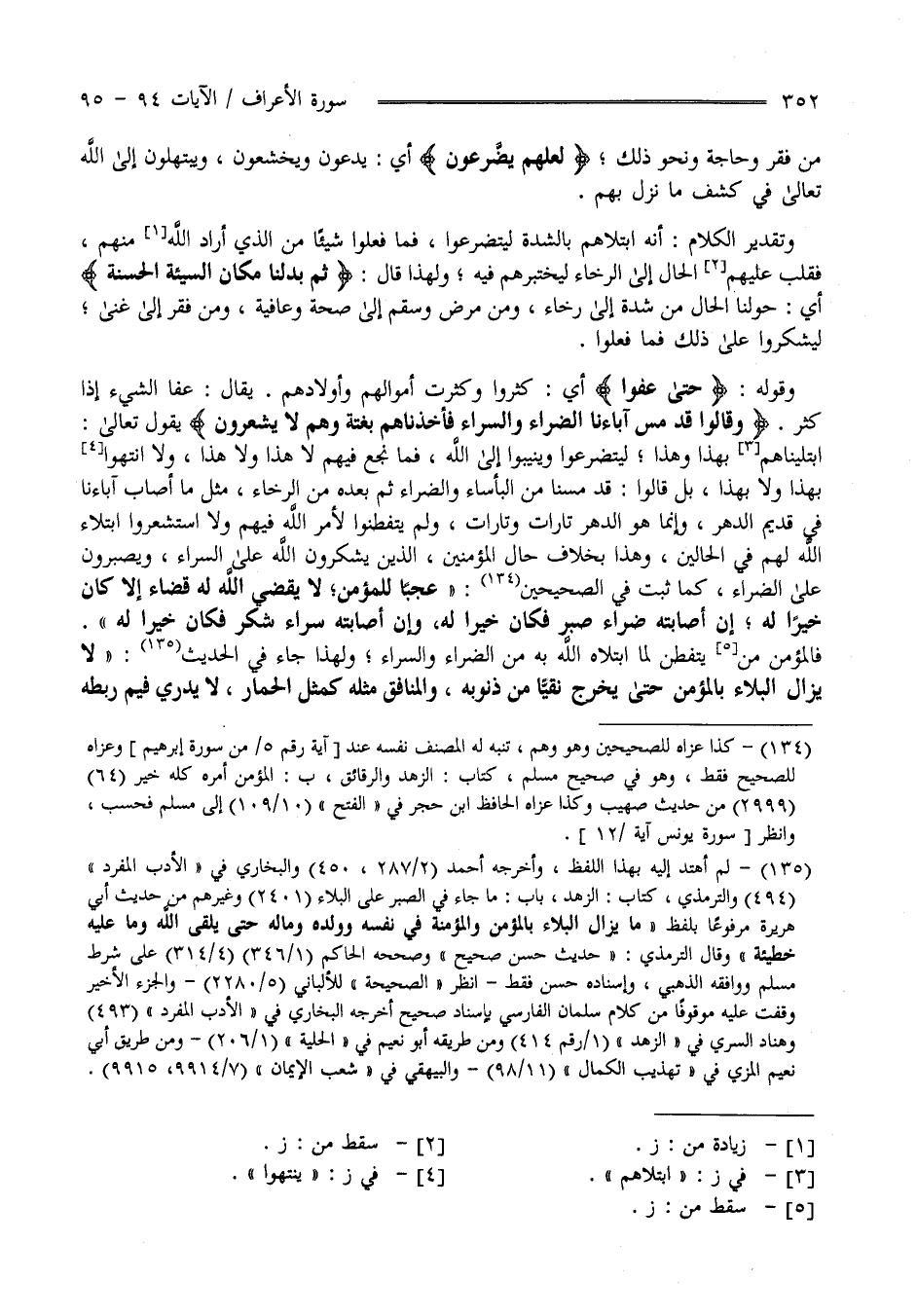 قَالَ " ثُمَّ بَدَّلْنَا مَكَان السَّيِّئَة الْحَسَنَة " أَيْ حَوَّلْنَا الْحَال مِنْ شِدَّة إِلَى رَخَاء وَمِنْ مَرَض وَسَقَم إِلَى صِحَّة وَعَافِيَة وَمِنْ فَقْر إِلَى غِنًى لِيَشْكُرُوا عَلَى ذَلِكَ فَمَا فَعَلُوا وَقَوْله " حَتَّى عَفَوْا " أَيْ كَثُرُوا وَكَثُرَتْ أَمْوَالهمْ وَأَوْلَادهمْ يُقَال عَفَا الشَّيْء إِذَا كَثُرَ" وَقَالُوا قَدْ مَسَّ آبَاءَنَا الضَّرَّاء وَالسَّرَّاء فَأَخَذْنَاهُمْ بَغْتَة وَهُمْ لَا يَشْعُرُونَ " يَقُول تَعَالَى اِبْتَلَيْنَاهُمْ بِهَذَا وَهَذَا لِيَتَضَرَّعُوا وَيُنِيبُوا إِلَى اللَّه فَمَا نَجَعَ فِيهِمْ لَا هَذَا وَلَا هَذَا وَلَا اِنْتَهَوْا بِهَذَا وَلَا بِهَذَا قَالُوا قَدْ مَسَّنَا مِنْ الْبَأْسَاء وَالضَّرَّاء ثُمَّ بَعْده مِنْ الرَّخَاء مِثْل مَا أَصَابَ آبَاءَنَا فِي قَدِيم الزَّمَان وَالدَّهْر وَإِنَّمَا هُوَ الدَّهْر تَارَات وَتَارَات بَلْ لَمْ يَتَفَطَّنُوا لِأَمْرِ اللَّه فِيهِمْ وَلَا اِسْتَشْعَرُوا اِبْتِلَاء اللَّه لَهُمْ فِي الْحَالَيْنِ وَهَذَا بِخِلَافِ حَال الْمُؤْمِنِينَ الَّذِينَ يَشْكُرُونَ اللَّه عَلَى السَّرَّاء وَيَصْبِرُونَ عَلَى الضَّرَّاء كَمَا ثَبَتَ فِي الصَّحِيحَيْنِ " عَجَبًا لِلْمُؤْمِنِ لَا يَقْضِي اللَّه لَهُ قَضَاء إِلَّا كَانَ خَيْرًا لَهُ إِنْ أَصَابَتْهُ ضَرَّاء صَبَرَ فَكَانَ خَيْرًا لَهُ وَإِنْ أَصَابَتْهُ سَرَّاء شَكَرَ فَكَانَ خَيْرًا لَهُ" فَالْمُؤْمِن مَنْ يَتَفَطَّن لِمَا اِبْتَلَاهُ اللَّه بِهِ مِنْ الضَّرَّاء وَالسَّرَّاء وَلِهَذَا جَاءَ فِي الْحَدِيث " لَا يَزَال الْبَلَاء بِالْمُؤْمِنِ حَتَّى يَخْرُج نَقِيًّا مِنْ ذُنُوبه وَالْمُنَافِق مَثَله كَمَثَلِ الْحِمَار لَا يَدْرِي فِيمَ رَبَطَهُ