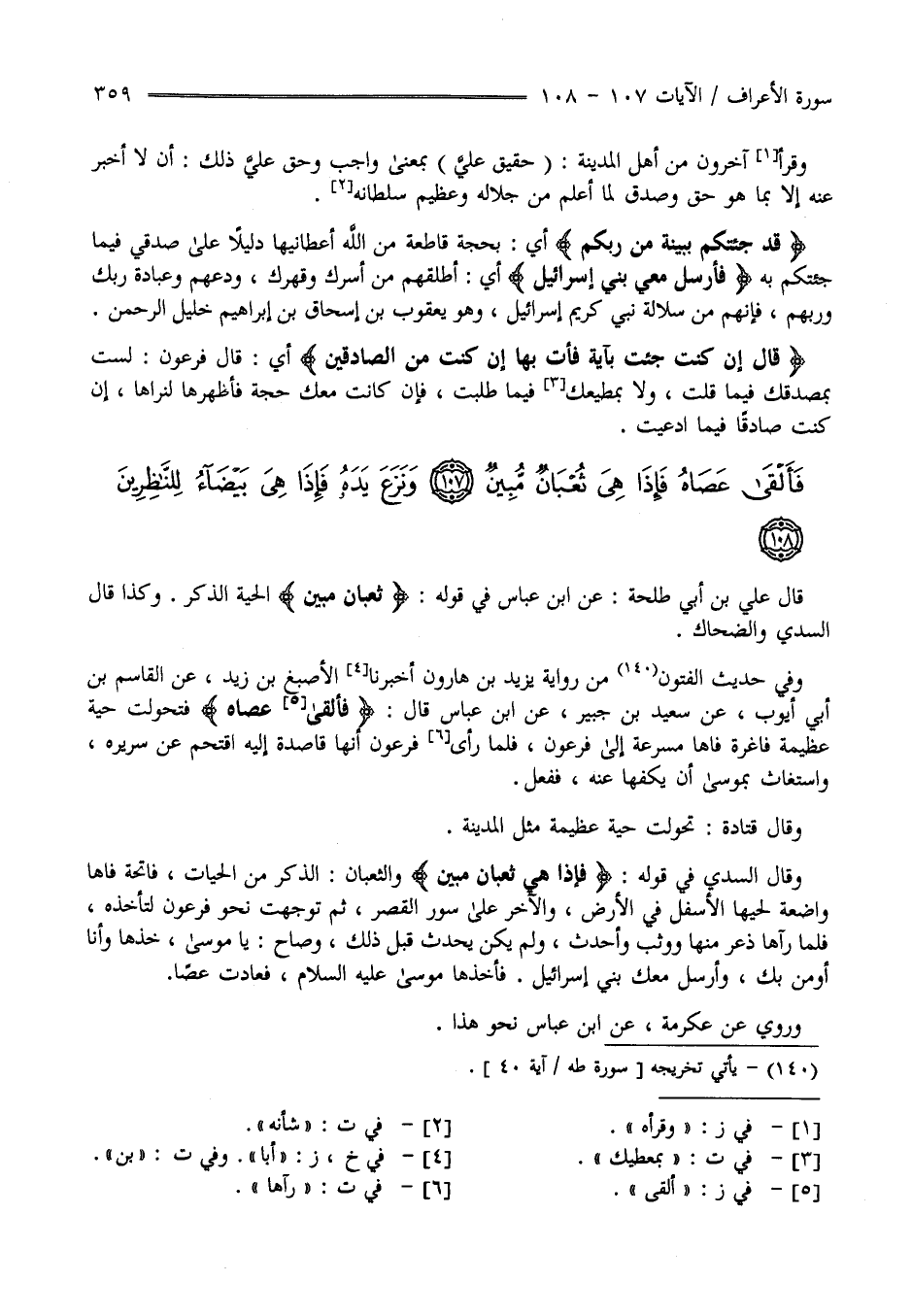قَالَ عَلِيّ بْن أَبِي طَلْحَة عَنْ اِبْن عَبَّاس فِي قَوْله " ثُعْبَان مُبِين " الْحَيَّة الذَّكَر وَكَذَا قَالَ السُّدِّيّ وَالضَّحَّاك وَفِي حَدِيث الْفُتُون مِنْ رِوَايَة يَزِيد بْن هَارُون بْن الْأَصْبَغ بْن زَيْد عَنْ الْقَاسِم بْن أَبِي أَيُّوب عَنْ سَعِيد بْن جُبَيْر عَنْ اِبْن عَبَّاس قَالَ" فَأَلْقَى عَصَاهُ " فَتَحَوَّلَتْ حَيَّة عَظِيمَة فَاغِرَة فَاهَا مُسْرِعَة إِلَى فِرْعَوْن فَلَمَّا رَآهَا فِرْعَوْن أَنَّهَا قَاصِدَة إِلَيْهِ اِقْتَحَمَ عَنْ سَرِيره وَاِسْتَغَاثَ بِمُوسَى أَنْ يَكُفّهَا عَنْهُ فَفَعَلَ وَقَالَ قَتَادَة : تَحَوَّلَتْ حَيَّة عَظِيمَة مِثْل الْمَدِينَة .