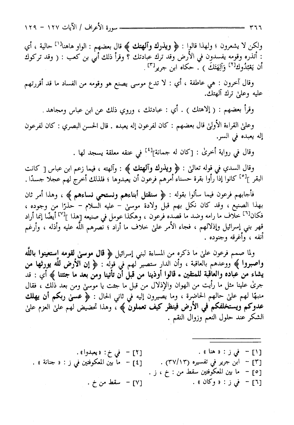 وَلَكِنْ لَا يَشْعُرُونَ وَلِهَذَا قَالُوا " وَيَذَرك وَآلِهَتك " قَالَ بَعْضهمْ الْوَاو هَاهُنَا حَالِيَّة أَيْ أَتَذَرُهُ وَقَوْمه يُفْسِدُونَ فِي الْأَرْض وَقَدْ تَرَكَ عِبَادَتك ؟ وَقَرَأَ ذَلِكَ أُبَيّ بْن كَعْب وَقَدْ تَرَكُوك أَنْ يَعْبُدُوك وَآلِهَتك حَكَاهُ اِبْن جَرِير وَقَالَ آخَرُونَ هِيَ عَاطِفَة أَيْ أَتَدَعُهُمْ يَصْنَعُونَ فِي الْفَسَاد مَا قَدْ أَقْرَرْتهمْ عَلَيْهِ وَعَلَى تَرْك آلِهَتك وَقَرَأَ بَعْضهمْ إِلَاهَتك أَيْ عِبَادَتك وَرُوِيَ ذَلِكَ عَنْ اِبْن عَبَّاس وَمُجَاهِد وَغَيْره وَعَلَى الْقِرَاءَة الْأُولَى قَالَ بَعْضهمْ : كَانَ لِفِرْعَوْن إِلَه يَعْبُدهُ قَالَ الْحَسَن الْبَصْرِيّ كَانَ لِفِرْعَوْن إِلَه يَعْبُدهُ فِي السِّرّ .