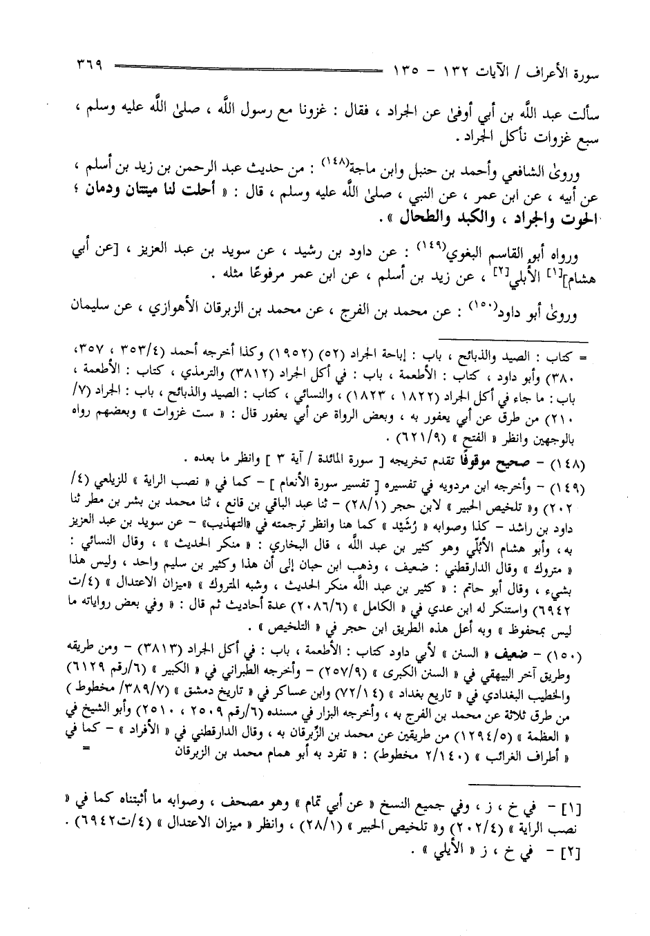 سَأَلْت عَبْد اللَّه بْن أَبِي أَوْفَى عَنْ الْجَرَاد فَقَالَ : غَزَوْنَا مَعَ رَسُول اللَّه صَلَّى اللَّه عَلَيْهِ وَسَلَّمَ سَبْع غَزَوَات نَأْكُل الْجَرَاد وَرَوَى الشَّافِعِيّ وَأَحْمَد بْن حَنْبَل وَابْن مَاجَهْ مِنْ حَدِيث عَبْد الرَّحْمَن بْن زَيْد بْن أَسْلَمَ عَنْ أَبِيهِ عَنْ اِبْن عُمَر عَنْ النَّبِيّ صَلَّى اللَّه عَلَيْهِ وَسَلَّمَ قَالَ " أُحِلَّتْ لَنَا مَيْتَتَانِ وَدَمَانِ .