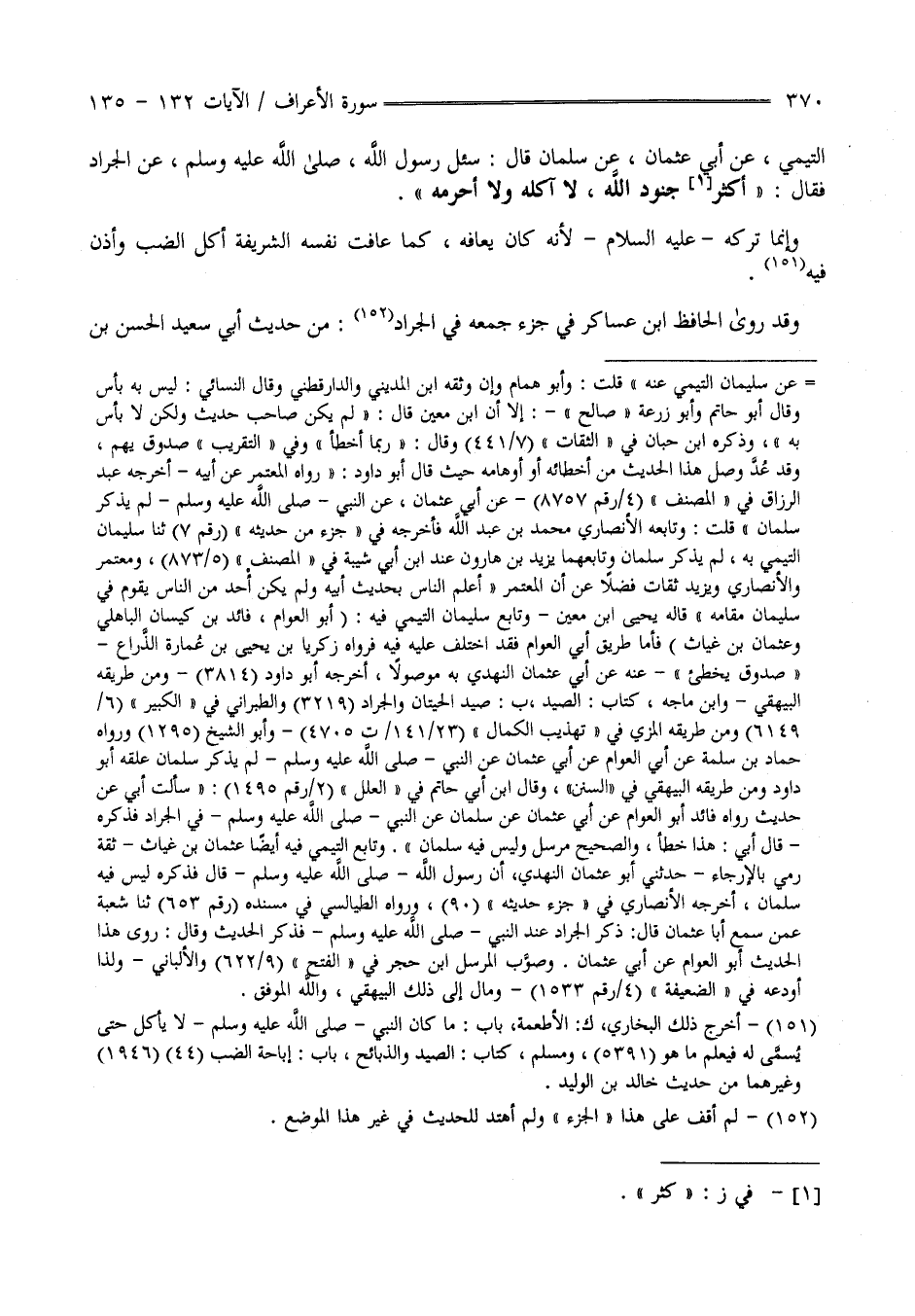 التَّيْمِيّ عَنْ أَبِي عُثْمَان عَنْ سَلْمَان قَالَ : سُئِلَ رَسُول اللَّه صَلَّى اللَّه عَلَيْهِ وَسَلَّمَ عَنْ الْجَرَاد فَقَالَ " أَكْثَر جُنُود اللَّه لَا آكُلهُ وَلَا أُحَرِّمهُ " وَإِنَّمَا تَرَكَهُ عَلَيْهِ السَّلَام لِأَنَّهُ كَانَ يَعَافهُ كَمَا عَافَتْ نَفْسه الشَّرِيفَة أَكْل الضَّبّ وَأَذِنَ فِيهِ وَقَدْ رَوَى الْحَافِظ اِبْن عَسَاكِر فِي جُزْء جَمَعَهُ فِي الْجَرَاد مِنْ حَدِيث أَبِي سَعِيد الْحَسَن بْن