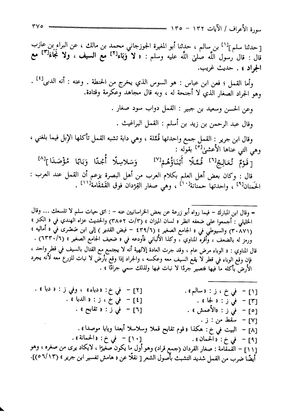 وَقَالَ عَبْد الرَّحْمَن بْن زَيْد بْن أَسْلَمَ الْقُمَّل الْبَرَاغِيث وَقَالَ اِبْن جَرِير الْقُمَّل جَمْع وَاحِدَتهَا قَمْلَة وَهِيَ دَابَّة تُشْبِه الْقَمْل تَأْكُلهَا الْإِبِل فِيمَا بَلَغَنِي وَهِيَ الَّتِي عَنَاهَا الْأَعْشَى بِقَوْلِهِ :