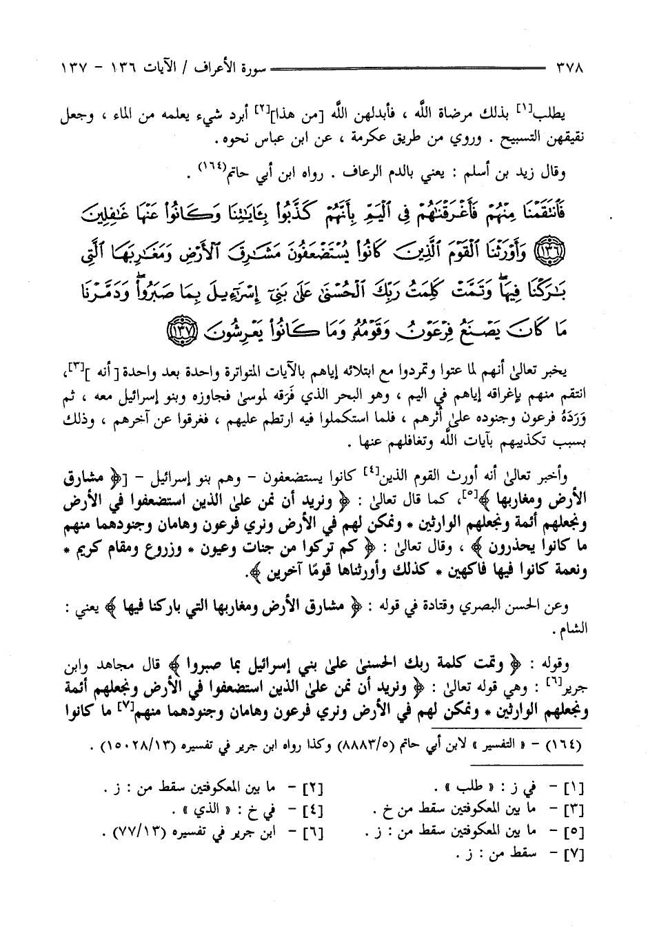 وَأَوْرَثْنَا الْقَوْمَ الَّذِينَ كَانُوا يُسْتَضْعَفُونَ مَشَارِقَ الْأَرْضِ وَمَغَارِبَهَا الَّتِي بَارَكْنَا فِيهَا وَتَمَّتْ كَلِمَةُ رَبِّكَ الْحُسْنَى عَلَى بَنِي إِسْرَائِيلَ بِمَا صَبَرُوا وَدَمَّرْنَا مَا كَانَ يَصْنَعُ فِرْعَوْنُ وَقَوْمُهُ وَمَا كَانُوا يَعْرِشُونَ (137)