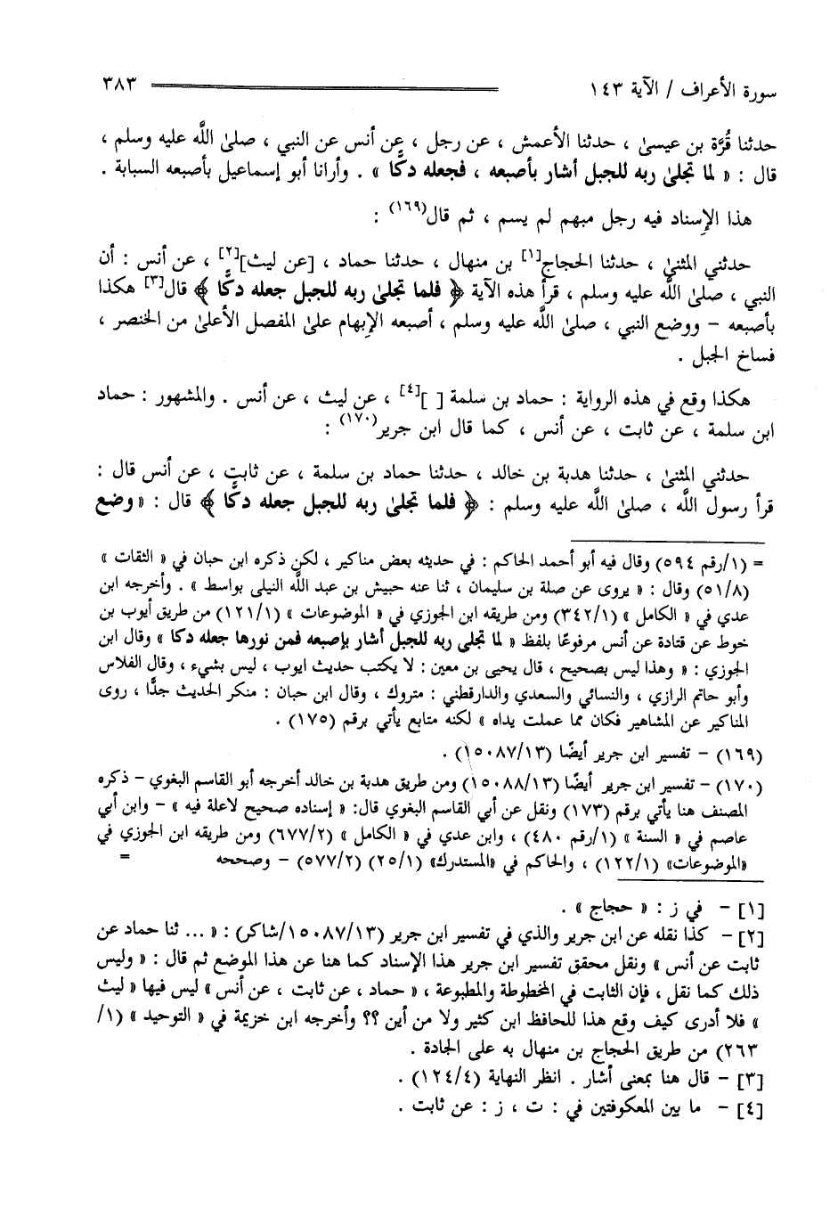 حَدَّثَنَا قُرَّة بْن عِيسَى حَدَّثَنَا الْأَعْمَش عَنْ رَجُل عَنْ أَنَس عَنْ النَّبِيّ صَلَّى اللَّه عَلَيْهِ وَسَلَّمَ قَالَ : " لَمَّا تَجَلَّى رَبّه لِلْجَبَلِ أَشَارَ بِأُصْبُعِهِ فَجَعَلَهُ دَكًّا " وَأَرَانَا أَبُو إِسْمَاعِيل بِأُصْبُعِهِ السَّبَّابَة هَذَا الْإِسْنَاد فِيهِ رَجُل مُبْهَم لَمْ يُسَمَّ ثُمَّ قَالَ حَدَّثَنِي الْمُثَنَّى حَدَّثَنَا حَجَّاج بْن مِنْهَال حَدَّثَنَا حَمَّاد عَنْ لَيْث عَنْ أَنَس أَنَّ النَّبِيّ صَلَّى اللَّه عَلَيْهِ وَسَلَّمَ قَرَأَ هَذِهِ الْآيَة " فَلَمَّا تَجَلَّى رَبّه لِلْجَبَلِ جَعَلَهُ دَكًّا " قَالَ " هَكَذَا بِأُصْبُعِهِ " وَوَضَعَ النَّبِيّ صَلَّى اللَّه عَلَيْهِ وَسَلَّمَ أُصْبُعه الْإِبْهَام عَلَى الْمِفْصَل الْأَعْلَى مِنْ الْخِنْصَر " فَسَاخَ الْجَبَل " هَكَذَا وَقَعَ فِي هَذِهِ الرِّوَايَة حَمَّاد بْن سَلَمَة عَنْ ثَابِت عَنْ لَيْث عَنْ أَنَس كَمَا قَالَ اِبْن جَرِير : حَدَّثَنِي الْمُثَنَّى حَدَّثَنَا هُدْبَة بْن خَالِد حَدَّثَنَا حَمَّاد بْن سَلَمَة عَنْ ثَابِت عَنْ أَنَس قَالَ : قَرَأَ رَسُول اللَّه صَلَّى اللَّه عَلَيْهِ وَسَلَّمَ " فَلَمَّا تَجَلَّى رَبّه لِلْجَبَلِ جَعَلَهُ دَكًّا " قَالَ " وَوَضَعَ