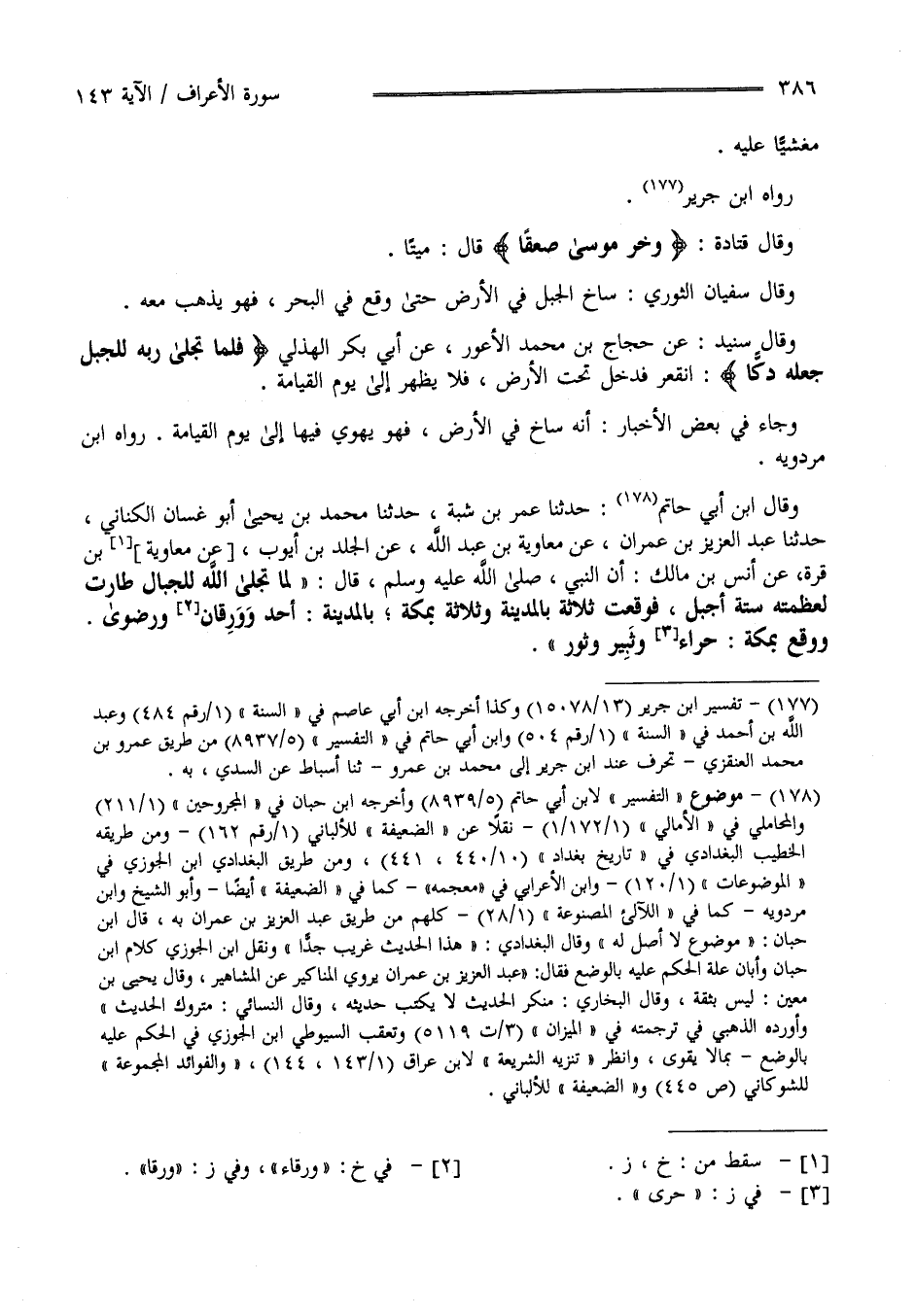وَقَالَ اِبْن أَبِي حَاتِم : حَدَّثَنَا عُمَر بْن شَيْبَة حَدَّثَنَا مُحَمَّد بْن يَحْيَى أَبُو غَسَّان الْكِنَانِيّ حَدَّثَنَا عَبْد الْعَزِيز بْن عِمْرَان عَنْ مُعَاوِيَة بْن عَبْد اللَّه عَنْ الْجَلْد بْن أَيُّوب عَنْ مُعَاوِيَة بْن قُرَّة عَنْ أَنَس بْن مَالِك أَنَّ النَّبِيّ صَلَّى اللَّه عَلَيْهِ وَسَلَّمَ قَالَ" لَمَّا تَجَلَّى اللَّه لِلْجِبَالِ طَارَتْ لِعَظَمَتِهِ سِتَّة أَجْبُل فَوَقَعَتْ ثَلَاثَة بِالْمَدِينَةِ وَثَلَاثَة بِمَكَّة بِالْمَدِينَةِ أُحُد وَوَرْقَان وَرَضْوَى وَوَقَعَ بِمَكَّة حِرَاء وَثَبِير وَثَوْر