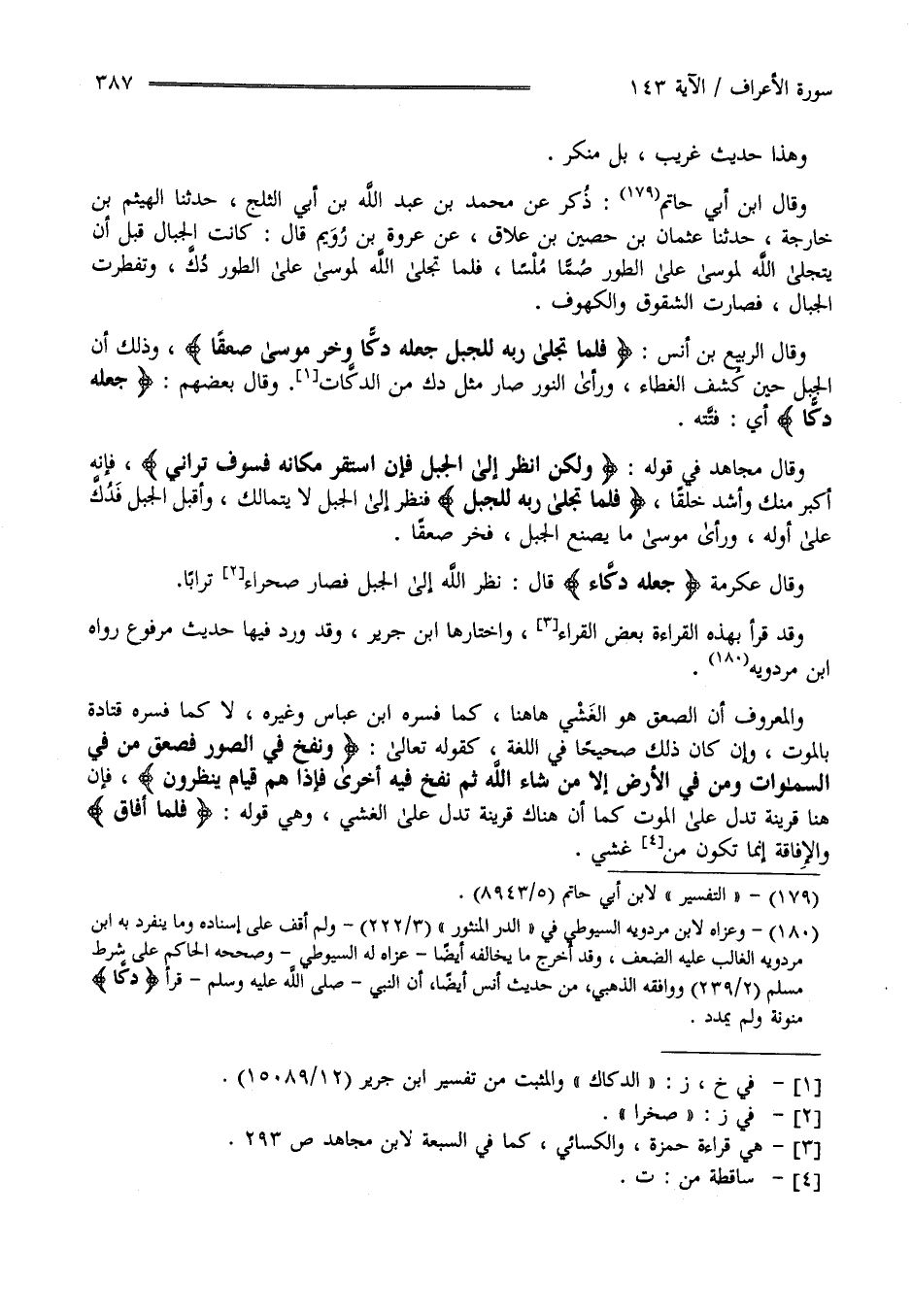 " وَهَذَا حَدِيث غَرِيب بَلْ مُنْكَر وَقَالَ اِبْن أَبِي حَاتِم : ذُكِرَ عَنْ مُحَمَّد بْن عَبْد اللَّه بْن أَبِي الْبَلْج حَدَّثَنَا الْهَيْثَم بْن خَارِجَة حَدَّثَنَا عُثْمَان بْن حُصَيْن بْن الْعَلَّاف عَنْ عُرْوَة بْن رُوَيْم قَالَ : كَانَتْ الْجِبَال قَبْل أَنْ يَتَجَلَّى اللَّه لِمُوسَى عَلَى الطُّور صَمَّاء مَلْسَاء فَلَمَّا تَجَلَّى اللَّه لِمُوسَى عَلَى الطُّور دُكَّ وَتَفَطَّرَتْ الْجِبَال فَصَارَتْ الشُّقُوق وَالْكُهُوف .