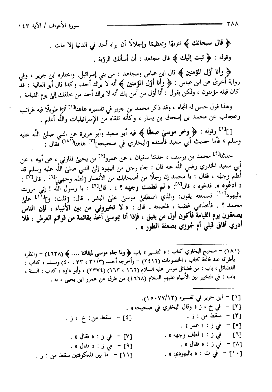 " قَالَ سُبْحَانك " تَنْزِيهًا وَتَعْظِيمًا وَإِجْلَالًا أَنْ يَرَاهُ أَحَد مِنْ الدُّنْيَا إِلَّا مَاتَ وَقَوْله" تُبْت إِلَيْك " قَالَ مُجَاهِد أَنْ أَسْأَلك الرُّؤْيَة " وَأَنَا أَوَّل الْمُؤْمِنِينَ " قَالَ اِبْن عَبَّاس وَمُجَاهِد مِنْ بَنِي إِسْرَائِيل وَاخْتَارَهُ اِبْن جَرِير وَفِي رِوَايَة أُخْرَى عَنْ اِبْن عَبَّاس " وَأَنَا أَوَّل الْمُؤْمِنِينَ " أَنَّهُ لَا يَرَاك أَحَد وَكَذَا قَالَ أَبُو الْعَالِيَة قَدْ كَانَ قَبْله مُؤْمِنُونَ وَلَكِنْ يَقُول أَنَا أَوَّل مَنْ آمَنَ بِك أَنَّهُ لَا يَرَاك أَحَد مِنْ خَلْقك إِلَى يَوْم الْقِيَامَة وَهَذَا قَوْل حَسَن لَهُ اِتِّجَاه وَقَدْ ذَكَرَ مُحَمَّد بْن جَرِير فِي تَفْسِيره هَاهُنَا أَثَرًا طَوِيلًا فِيهِ غَرَائِب وَعَجَائِب عَنْ مُحَمَّد بْن إِسْحَاق بْن يَسَار وَكَأَنَّهُ تَلَقَّاهُ مِنْ الْإِسْرَائِيلِيَّات وَاَللَّه أَعْلَم وَقَوْله " وَخَرَّ مُوسَى صَعِقًا " فِيهِ أَبُو سَعِيد وَأَبِي هُرَيْرَة عَنْ النَّبِيّ صَلَّى اللَّه عَلَيْهِ وَسَلَّمَ فَأَمَّا حَدِيث أَبِي سَعِيد فَأَسْنَدَهُ الْبُخَارِيّ فِي صَحِيحه هَاهُنَا فَقَالَ حَدَّثَنَا مُحَمَّد بْن يُوسُف حَدَّثَنَا سُفْيَان عَنْ عَمْرو بْن يَحْيَى الْمَازِنِيّ عَنْ أَبِيهِ عَنْ أَبِي سَعِيد الْخُدْرِيّ رَضِيَ اللَّه عَنْهُ قَالَ : جَاءَ رَجُل مِنْ الْيَهُود إِلَى النَّبِيّ صَلَّى اللَّه عَلَيْهِ وَسَلَّمَ قَدْ لُطِمَ وَجْهه وَقَالَ : يَا مُحَمَّد إِنَّ رَجُلًا مِنْ أَصْحَابك مِنْ الْأَنْصَار لَطَمَ وَجْهِي قَالَ " اُدْعُوهُ " فَدَعَوْهُ قَالَ " لِمَ لَطَمْت وَجْهه ؟ " قَالَ : يَا رَسُول اللَّه إِنِّي مَرَرْت بِالْيَهُودِيِّ فَسَمِعْته يَقُول وَاَلَّذِي اِصْطَفَى مُوسَى عَلَى الْبَشَر قَالَ وَعَلَى مُحَمَّد ؟ قَالَ فَقُلْت وَعَلَى مُحَمَّد وَأَخَذَتْنِي غَضْبَة فَلَطَمْته قَالَ " لَا تُخَيِّرُونِي مِنْ بَيْن الْأَنْبِيَاء فَإِنَّ النَّاس يَصْعَقُونَ يَوْم الْقِيَامَة فَأَكُون أَوَّل مَنْ يُفِيق فَإِذَا أَنَا بِمُوسَى آخِذ بِقَائِمَةٍ مِنْ قَوَائِم الْعَرْش فَلَا أَدْرِي أَفَاقَ قَبْلِي أَمْ جُوزِيَ بِصَعْقَةِ الطُّور "