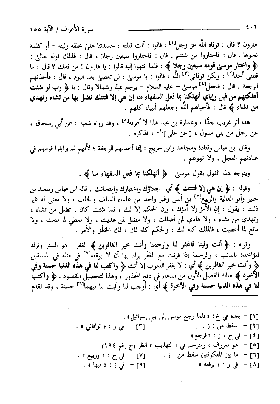 هَارُون قَالَ تَوَفَّاهُ اللَّه عَزَّ وَجَلَّ قَالُوا أَنْتَ قَتَلْته حَسَدْتنَا عَلَى خُلُقه وَلِينه أَوْ كَلِمَة نَحْوهَا قَالَ فَاخْتَارُوا مَنْ شِئْتُمْ قَالَ فَاخْتَارُوا سَبْعِينَ رَجُلًا قَالَ فَذَلِكَ قَوْله تَعَالَى " وَاخْتَارَ مُوسَى قَوْمه سَبْعِينَ رَجُلًا " فَلَمَّا اِنْتَهَوْا إِلَيْهِ قَالُوا يَا هَارُون مَنْ قَتَلَك قَالَ مَا قَتَلَنِي أَحَد وَلَكِنْ تَوَفَّانِي اللَّه قَالُوا يَا مُوسَى لَنْ تُعْصَى بَعْد الْيَوْم فَأَخَذَتْهُمْ الرَّجْفَة قَالَ فَجَعَلَ مُوسَى عَلَيْهِ السَّلَام يَرْجِع يَمِينًا وَشِمَالًا وَقَالَ يَا رَبّ " لَوْ شِئْت أَهْلَكْتهمْ مِنْ قَبْل وَإِيَّايَ أَتُهْلِكُنَا بِمَا فَعَلَ السُّفَهَاء مِنَّا إِنْ هِيَ إِلَّا فِتْنَتك تُضِلّ بِهَا مَنْ تَشَاء وَتَهْدِي مَنْ تَشَاء " قَالَ فَأَحْيَاهُمْ اللَّه وَجَعَلَهُمْ أَنْبِيَاء كُلّهمْ هَذَا أَثَر غَرِيب جِدًّا وَعُمَارَة بْن عُبَيْد هَذَا لَا أَعْرِفهُ وَقَدْ رَوَاهُ شُعْبَة عَنْ أَبِي إِسْحَاق عَنْ رَجُل مِنْ بَنِي سَلُول عَنْ عَلِيّ فَذَكَرَهُ وَقَالَ اِبْن عَبَّاس وَقَتَادَة وَمُجَاهِد وَابْن جَرِير أَنَّهُمْ أَخَذَتْهُمْ الرَّجْفَة لِأَنَّهُمْ لَمْ يُزَايِلُوا قَوْمهمْ فِي عِبَادَتهمْ الْعِجْل وَلَا نَهَوْهُمْ وَيَتَوَجَّه هَذَا الْقَوْل بِقَوْلِ مُوسَى " أَتُهْلِكُنَا بِمَا فَعَلَ السُّفَهَاء مِنَّا " وَقَوْله " إِنْ هِيَ إِلَّا فِتْنَتك" أَيْ اِبْتِلَاؤُك وَاخْتِبَارك وَامْتِحَانك قَالَهُ اِبْن عَبَّاس وَسَعِيد بْن جُبَيْر وَأَبُو الْعَالِيَة وَرَبِيع بْن أَنَس وَغَيْر وَاحِد مِنْ عُلَمَاء السَّلَف وَالْخَلَف وَلَا مَعْنَى لَهُ غَيْر ذَلِكَ يَقُول إِنْ الْأَمْر إِلَّا أَمْرك وَإِنْ الْحُكْم إِلَّا لَك فَمَا شِئْت كَانَ تُضِلّ مَنْ تَشَاء وَتَهْدِي مَنْ تَشَاء وَلَا هَادِي لِمَنْ أَضْلَلْت وَلَا مُضِلّ لِمَنْ هَدَيْت وَلَا مُعْطِي لِمَا مَنَعْت وَلَا مَانِع لِمَا أَعْطَيْت فَالْمُلْك كُلّه لَك وَالْحُكْم كُلّه لَك لَك الْخَلْق وَالْأَمْر وَقَوْله " أَنْتَ وَلِيّنَا فَاغْفِرْ لَنَا وَارْحَمْنَا وَأَنْتَ خَيْر الْغَافِرِينَ " الْغَفْر هُوَ السَّتْر وَتَرْك الْمُؤَاخَذَة بِالذَّنْبِ وَالرَّحْمَة إِذَا قُرِنَتْ مَعَ الْغَفْر يُرَاد بِهَا أَنْ لَا يُوقِعهُ فِي مِثْله فِي الْمُسْتَقْبَل" وَأَنْتَ خَيْر الْغَافِرِينَ " أَنْ لَا يَغْفِر الذُّنُوب إِلَّا أَنْتَ .