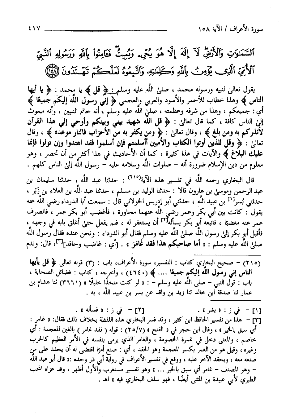 يَقُول تَعَالَى لِنَبِيِّهِ وَرَسُوله مُحَمَّد صَلَّى اللَّه عَلَيْهِ وَسَلَّمَ " قُلْ " يَا مُحَمَّد " يَا أَيّهَا النَّاس " وَهَذَا خِطَاب لِلْأَحْمَرِ وَالْأَسْوَد وَالْعَرَبِيّ وَالْعَجَمِيّ " إِنِّي رَسُول اللَّه إِلَيْكُمْ جَمِيعًا " أَيْ جَمِيعكُمْ وَهَذَا مِنْ شَرَفه وَعَظَمَته صَلَّى اللَّه عَلَيْهِ وَسَلَّمَ أَنَّهُ خَاتَم النَّبِيِّينَ وَأَنَّهُ مَبْعُوث إِلَى النَّاس كَافَّة كَمَا قَالَ اللَّه تَعَالَى " قُلْ اللَّه شَهِيد بَيْنِي وَبَيْنكُمْ وَأُوحِيَ إِلَيَّ هَذَا الْقُرْآن لِأُنْذِركُمْ بِهِ وَمَنْ بَلَغَ " وَقَالَ تَعَالَى " وَمَنْ يَكْفُر بِهِ مِنْ الْأَحْزَاب فَالنَّار مَوْعِده " وَقَالَ تَعَالَى " وَقُلْ لِلَّذِينَ أُوتُوا الْكِتَاب وَالْأُمِّيِّينَ أَأَسْلَمْتُمْ فَإِنْ أَسْلَمُوا فَقَدْ اِهْتَدَوْا وَإِنْ تَوَلَّوْا فَإِنَّمَا عَلَيْك الْبَلَاغ " وَالْآيَات فِي هَذَا كَثِيرَة كَمَا أَنَّ الْأَحَادِيث فِي هَذَا أَكْثَر مِنْ أَنْ تُحْصَر وَهُوَ مَعْلُوم مِنْ دِين الْإِسْلَام ضَرُورَة أَنَّهُ صَلَوَات اللَّه وَسَلَامه عَلَيْهِ رَسُول اللَّه إِلَى النَّاس كُلّهمْ قَالَ الْبُخَارِيّ رَحِمَهُ اللَّه فِي تَفْسِير هَذِهِ الْآيَة حَدَّثَنَا عَبْد اللَّه حَدَّثَنَا سُلَيْمَان بْن عَبْد الرَّحْمَن وَمُوسَى بْن هَارُون قَالَا حَدَّثَنَا الْوَلِيد بْن مُسْلِم حَدَّثَنَا عَبْد اللَّه بْن الْعَلَاء بْن زَيْد حَدَّثَنِي بِشْر بْن عُبَيْد اللَّه حَدَّثَنِي أَبُو إِدْرِيس الْخَوْلَانِيّ قَالَ سَمِعْت أَبَا الدَّرْدَاء رَضِيَ اللَّه عَنْهُ يَقُول : كَانَتْ بَيْن أَبِي بَكْر وَعُمَر رَضِيَ اللَّه عَنْهُمَا مُحَاوَرَة فَأَغْضَبَ أَبُو بَكْر عُمَر فَانْصَرَفَ عَنْهُ عُمَر مُغْضَبًا فَأَتْبَعَهُ أَبُو بَكْر يَسْأَلهُ أَنْ يَسْتَغْفِر لَهُ فَلَمْ يَفْعَل حَتَّى أَغْلَقَ بَابه فِي وَجْهه فَأَقْبَلَ أَبُو بَكْر إِلَى رَسُول اللَّه صَلَّى اللَّه عَلَيْهِ وَسَلَّمَ فَقَالَ أَبُو الدَّرْدَاء وَنَحْنُ عِنْده فَقَالَ رَسُول اللَّه صَلَّى اللَّه عَلَيْهِ وَسَلَّمَ " أَمَّا صَاحِبكُمْ هَذَا فَقَدْ غَامَرَ " أَيْ غَاضَبَ وَحَاقَدَ قَالَ وَنَدِمَ
