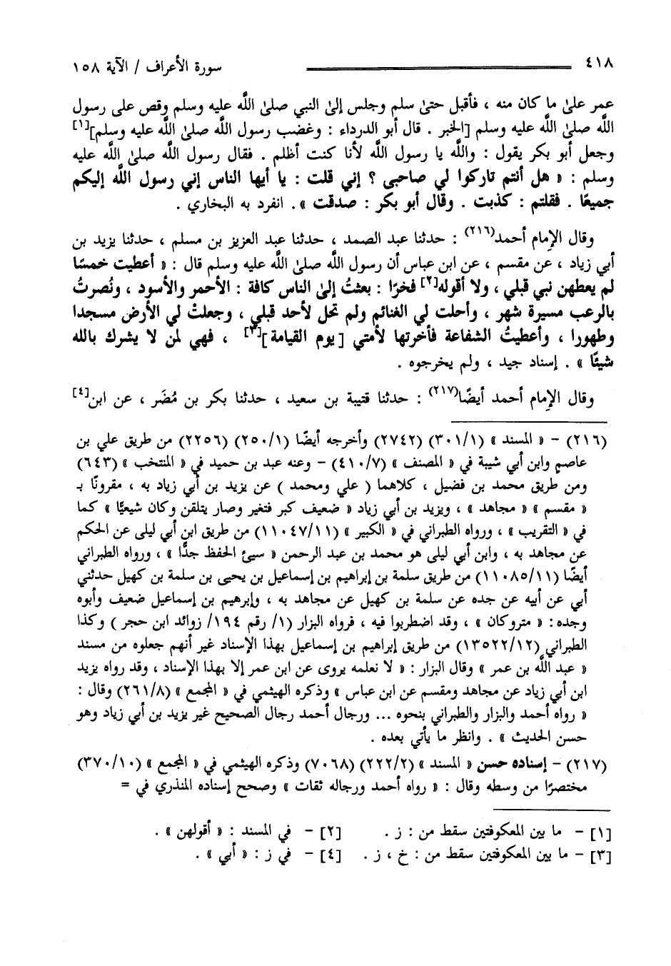 وَقَالَ الْإِمَام أَحْمَد حَدَّثَنَا عَبْد الصَّمَد حَدَّثَنَا عَبْد الْعَزِيز بْن مُسْلِم حَدَّثَنَا يَزِيد بْن أَبِي زِيَاد عَنْ مِقْسَم عَنْ اِبْن عَبَّاس مَرْفُوعًا أَنَّ رَسُول اللَّه صَلَّى اللَّه عَلَيْهِ وَسَلَّمَ قَالَ " أُعْطِيت خَمْسًا لَمْ يُعْطَهُنَّ نَبِيّ قَبْلِي وَلَا أَقُولهُ فَخْرًا : بُعِثْت إِلَى النَّاس كَافَّة الْأَحْمَر وَالْأَسْوَد وَنُصِرْت بِالرُّعْبِ مَسِيرَة شَهْر وَأُحِلَّتْ لِيَ الْغَنَائِم وَلَمْ تُحَلّ لِأَحَدٍ قَبْلِي وَجُعِلَتْ لِيَ الْأَرْض مَسْجِدًا وَطَهُورًا وَأُعْطِيت الشَّفَاعَة فَأَخَّرْتهَا لِأُمَّتِي يَوْم الْقِيَامَة فَهِيَ لِمَنْ لَا يُشْرِك بِاَللَّهِ شَيْئًا " إِسْنَاد جَيِّد وَلَمْ يُخَرِّجُوهُ وَقَالَ الْإِمَام أَحْمَد أَيْضًا حَدَّثَنَا قُتَيْبَة بْن سَعِيد حَدَّثَنَا بَكْر بْن مُضَر عَنْ أَبِي