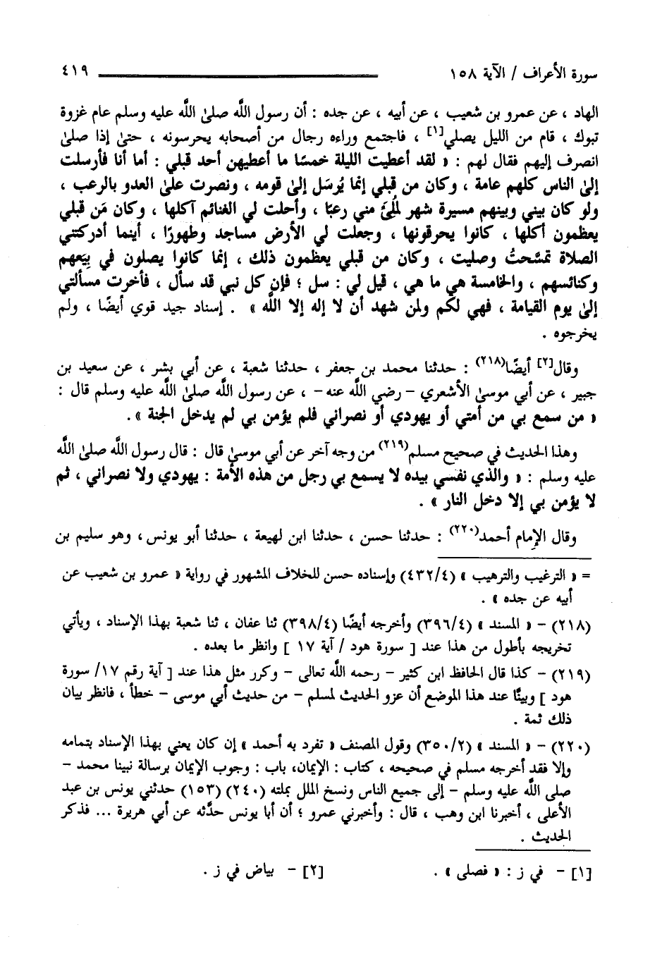 إِسْنَاد جَيِّد قَوِيّ أَيْضًا وَلَمْ يُخَرِّجُوهُ وَقَالَ أَيْضًا حَدَّثَنَا مُحَمَّد بْن جَعْفَر حَدَّثَنَا شُعْبَة عَنْ أَبِي بِشْر عَنْ سَعِيد بْن جُبَيْر عَنْ أَبِي مُوسَى الْأَشْعَرِيّ رَضِيَ اللَّه عَنْهُ عَنْ صَلَّى اللَّه عَلَيْهِ وَسَلَّمَ قَالَ :" مَنْ سَمِعَ بِي مِنْ أُمَّتِي أَوْ يَهُودِيّ أَوْ نَصْرَانِيّ فَلَمْ يُؤْمِن بِي لَمْ يَدْخُل الْجَنَّة " .