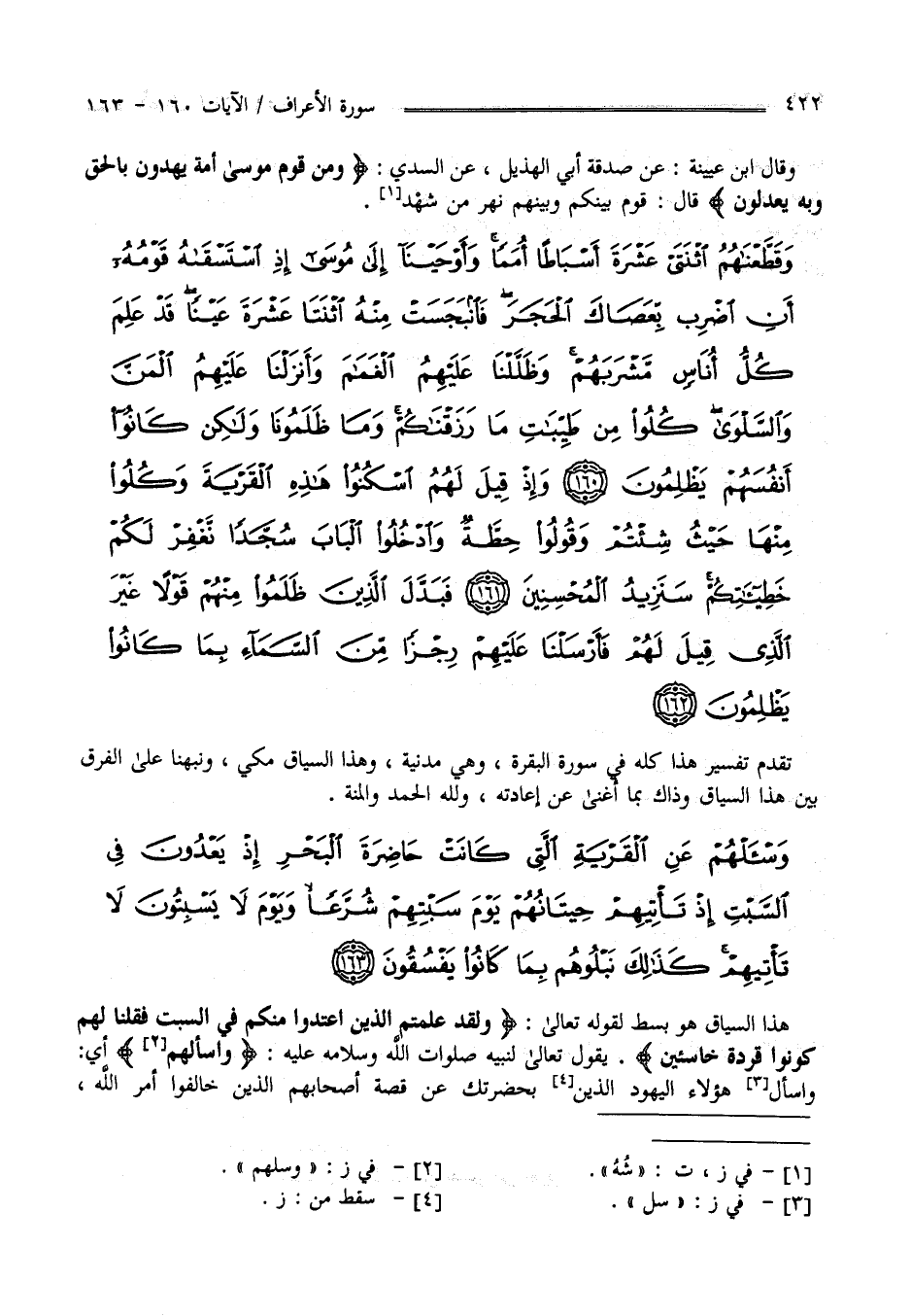 وَقَطَّعْنَاهُمُ اثْنَتَيْ عَشْرَةَ أَسْبَاطًا أُمَمًا وَأَوْحَيْنَا إِلَى مُوسَى إِذِ اسْتَسْقَاهُ قَوْمُهُ أَنِ اضْرِبْ بِعَصَاكَ الْحَجَرَ فَانْبَجَسَتْ مِنْهُ اثْنَتَا عَشْرَةَ عَيْنًا قَدْ عَلِمَ كُلُّ أُنَاسٍ مَشْرَبَهُمْ وَظَلَّلْنَا عَلَيْهِمُ الْغَمَامَ وَأَنْزَلْنَا عَلَيْهِمُ الْمَنَّ وَالسَّلْوَى كُلُوا مِنْ طَيِّبَاتِ مَا رَزَقْنَاكُمْ وَمَا ظَلَمُونَا وَلَكِنْ كَانُوا أَنْفُسَهُمْ يَظْلِمُونَ (160)