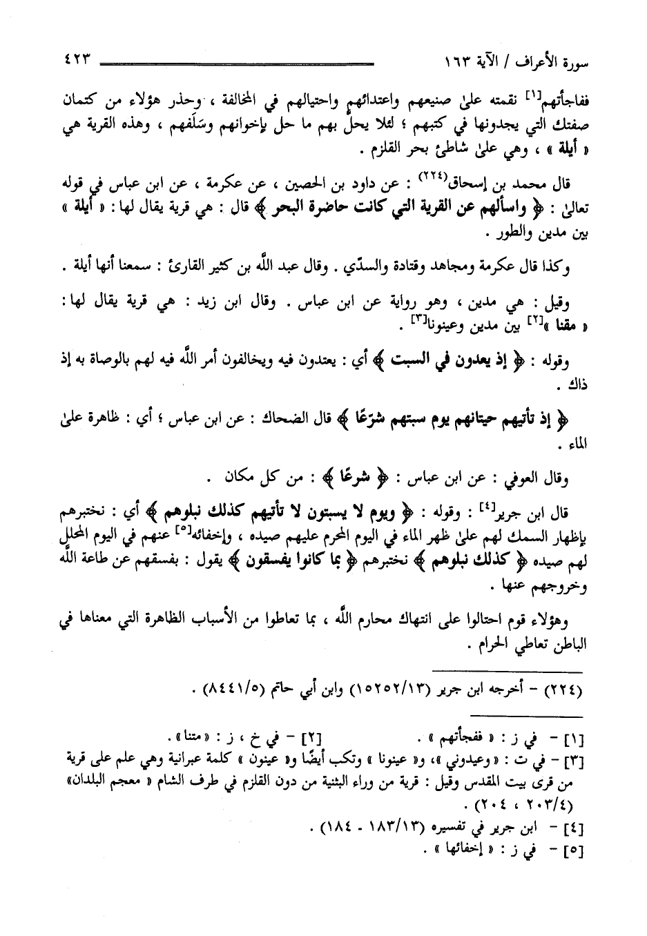 اللَّه فَفَاجَأَتْهُمْ نِقْمَته عَلَى صَنِيعهمْ وَاعْتِدَائِهِمْ وَاحْتِيَالهمْ فِي الْمُخَالَفَة وَحَذَّرَ هَؤُلَاءِ مِنْ كِتْمَان صِفَتك الَّتِي يَجِدُونَهَا فِي كُتُبهمْ لِئَلَّا يَحِلّ بِهِمْ مَا حَلَّ بِإِخْوَانِهِمْ وَسَلَفهمْ وَهَذِهِ الْقَرْيَة هِيَ أَيْلَة وَهِيَ عَلَى شَاطِئ بَحْر الْقُلْزُم قَالَ مُحَمَّد بْن إِسْحَاق عَنْ دَاوُدَ بْن الْحُصَيْن عَنْ عِكْرِمَة عَنْ اِبْن عَبَّاس فِي قَوْله تَعَالَى " وَاسْأَلْهُمْ عَنْ الْقَرْيَة الَّتِي كَانَتْ حَاضِرَة الْبَحْر " قَالَ هِيَ قَرْيَة يُقَال لَهَا أَيْلَة بَيْن مَدْيَن وَالطُّور وَكَذَا قَالَ عِكْرِمَة وَمُجَاهِد وَقَتَادَة وَالسُّدِّيّ وَقَالَ عَبْد اللَّه بْن كَثِير الْقَارِي سَمِعْنَا أَنَّهَا أَيْلَة وَقِيلَ هِيَ مَدْيَن وَهُوَ رِوَايَة عَنْ اِبْن عَبَّاس وَقَالَ اِبْن زَيْد هِيَ قَرْيَة يُقَال لَهَا مَعْتَا بَيْن مَدْيَن وَعَيْنُونَا وَقَوْله " إِذْ يَعْدُونَ فِي السَّبْت" أَيْ يَعْتَدُونَ فِيهِ وَمُخَالِفُونَ أَمْر اللَّه فِيهِ لَهُمْ بِالْوَصَاةِ بِهِ إِذْ ذَاكَ " إِذْ تَأْتِيهِمْ حِيتَانهمْ يَوْم سَبْتهمْ شُرَّعًا " قَالَ الضَّحَّاك عَنْ اِبْن عَبَّاس أَيْ ظَاهِرَة عَلَى الْمَاء وَقَالَ الْعَوْفِيّ عَنْ اِبْن عَبَّاس ظَاهِرَة مِنْ كُلّ مَكَان قَالَ اِبْن جَرِير وَقَوْله " وَيَوْم لَا يَسْبِتُونَ لَا تَأْتِيهِمْ كَذَلِكَ نَبْلُوهُمْ " أَيْ نَخْتَبِرهُمْ بِإِظْهَارِ السَّمَك لَهُمْ عَلَى ظَهْر الْمَاء فِي الْيَوْم الْمُحَرَّم عَلَيْهِمْ صَيْده وَإِخْفَائِهَا عَنْهُمْ فِي الْيَوْم الْحَلَال لَهُمْ صَيْده " كَذَلِكَ نَبْلُوهُمْ" نَخْتَبِرهُمْ " بِمَا كَانُوا يَفْسُقُونَ " يَقُول بِفِسْقِهِمْ عَنْ طَاعَة اللَّه وَخُرُوجهمْ عَنْهَا وَهَؤُلَاءِ قَوْم اِحْتَالُوا عَلَى اِنْتَهَاك مَحَارِم اللَّه بِمَا تَعَاطَوْا مِنْ الْأَسْبَاب الظَّاهِرَة الَّتِي مَعْنَاهَا فِي الْبَاطِن تَعَاطِي الْحَرَام