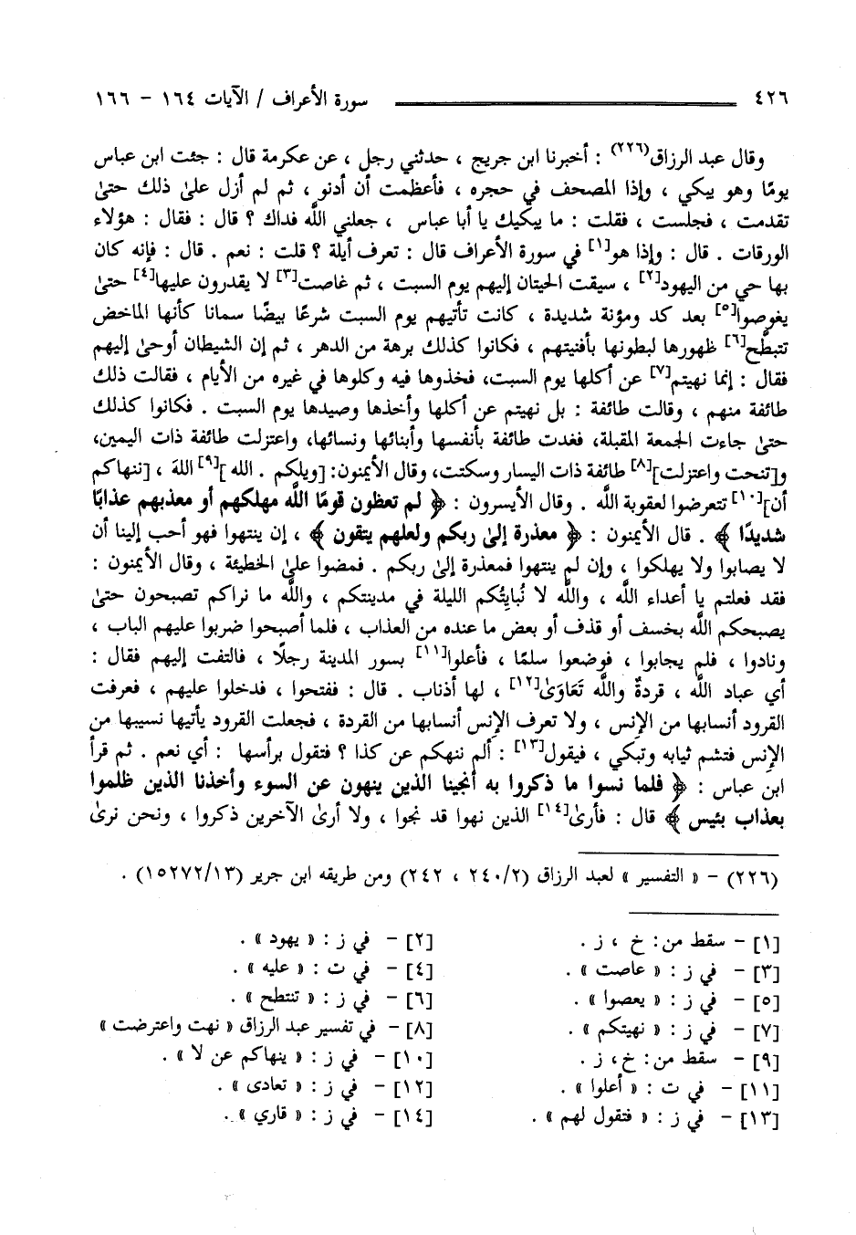 وَقَالَ عَبْد الرَّزَّاق أَخْبَرَنَا اِبْن جُرَيْج حَدَّثَنِي رَجُل عَنْ عِكْرِمَة قَالَ جِئْت اِبْن عَبَّاس يَوْمًا وَهُوَ يَبْكِي وَإِذَا الْمُصْحَف فِي حِجْره فَأَعْظَمْت أَنْ أَدْنُو مِنْهُ ثُمَّ لَمْ أَزَلْ عَلَى ذَلِكَ حَتَّى تَقَدَّمْت فَجَلَسْت فَقُلْت مَا يُبْكِيك يَا اِبْن عَبَّاس جَعَلَنِي اللَّه فِدَاك ؟ قَالَ فَقَالَ هَؤُلَاءِ الْوَرَقَات قَالَ وَإِذَا هُوَ فِي سُورَة الْأَعْرَاف قَالَ تَعْرِف أَيْلَة ؟ قُلْت نَعَمْ قَالَ فَإِنَّهُ كَانَ بِهَا حَيّ مِنْ الْيَهُود سِيقَتْ الْحِيتَان إِلَيْهِمْ يَوْم السَّبْت ثُمَّ غَاصَتْ لَا يَقْدِرُونَ عَلَيْهَا حَتَّى يَغُوصُوا بَعْد كَدّ وَمُؤْنَة شَدِيدَة كَانَتْ تَأْتِيهِمْ يَوْم سَبْتهمْ شُرَّعًا بَيْضَاء سِمَانًا كَأَنَّهَا الْمَاخِض تَنْتَطِح ظُهُورهَا لِبُطُونِهَا بِأَفْنِيَتِهِمْ فَكَانُوا كَذَلِكَ