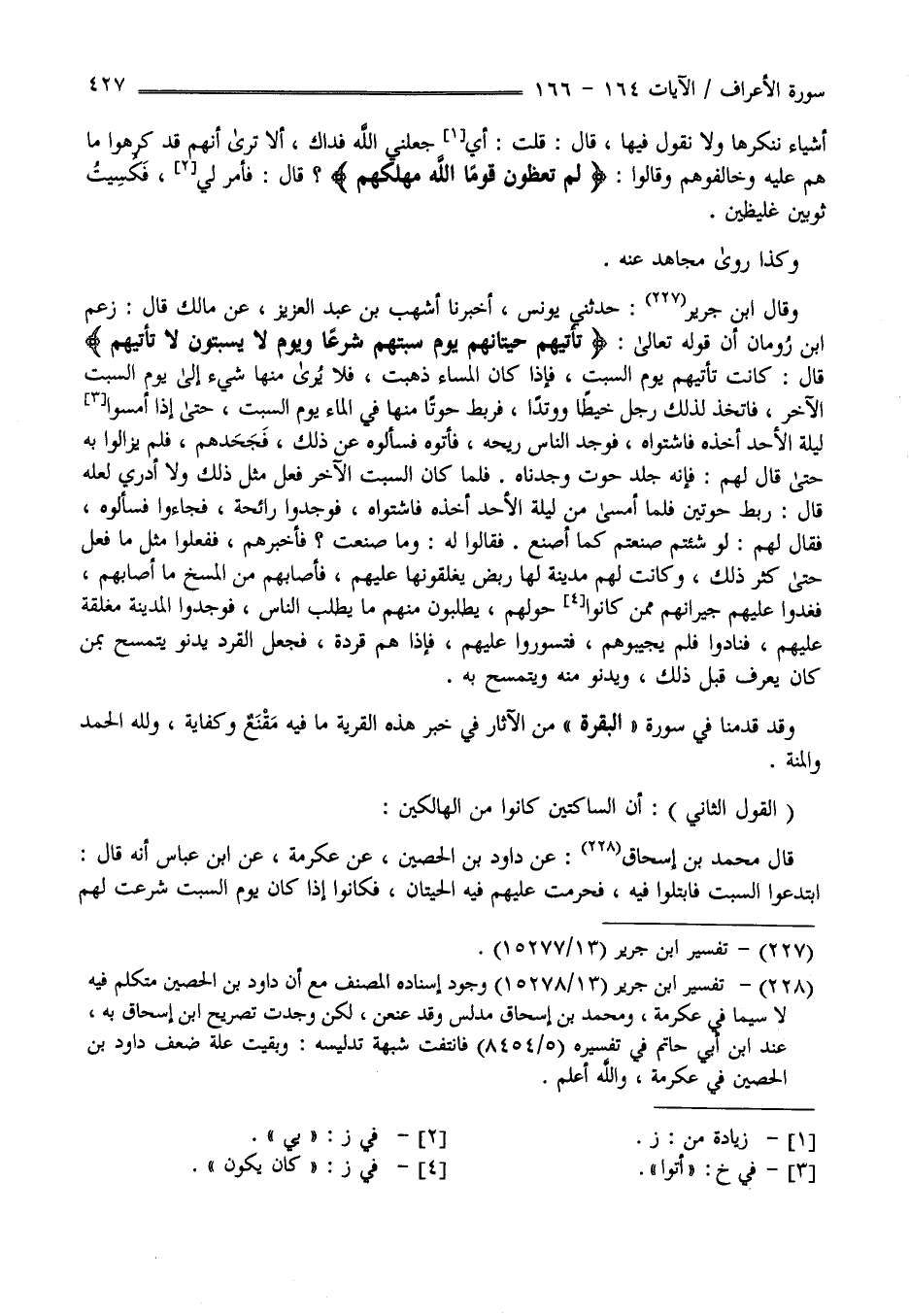 مُجَاهِد عَنْهُ وَقَالَ اِبْن جَرِير حَدَّثَنَا يُونُس أَخْبَرَنَا أَشْهَب بْن عَبْد الْعَزِيز عَنْ مَالِك قَالَ زَعَمَ اِبْن رُومَان أَنَّ قَوْله تَعَالَى" تَأْتِيهِمْ حِيتَانهمْ يَوْم سَبْتهمْ شُرَّعًا وَيَوْم لَا يَسْبِتُونَ لَا تَأْتِيهِمْ " قَالَ كَانَتْ تَأْتِيهِمْ يَوْم السَّبْت فَإِذَا كَانَ الْمَسَاء ذَهَبَتْ فَلَا يُرَى مِنْهَا شَيْء إِلَى يَوْم السَّبْت الْآخَر فَاِتَّخَذَ لِذَلِكَ رَجُل خَيْطًا وَوَتِدًا فَرَبَطَ حُوتًا مِنْهَا فِي الْمَاء يَوْم السَّبْت حَتَّى إِذَا أَمْسَوْا لَيْلَة الْأَحَد أَخَذَهُ فَاشْتَوَاهُ فَوَجَدَ النَّاس رِيحه فَأَتَوْهُ فَسَأَلُوهُ عَنْ ذَلِكَ فَجَحَدَهُمْ فَلَمْ يَزَالُوا بِهِ حَتَّى قَالَ لَهُمْ فَإِنَّهُ جِلْد حُوت وَجَدْنَاهُ فَلَمَّا كَانَ السَّبْت الْآخَر فَعَلَ مِثْل ذَلِكَ وَلَا أَدْرِي لَعَلَّهُ قَالَ رَبَطَ حُوتَيْنِ فَلَمَّا أَمْسَى مِنْ لَيْلَة الْأَحَد أَخَذَهُ فَاشْتَوَاهُ فَوَجَدُوا رَائِحَة فَجَاءُوا فَسَأَلُوهُ فَقَالَ لَهُمْ لَوْ شِئْتُمْ صَنَعْتُمْ كَمَا أَصْنَع فَقَالُوا لَهُ وَمَا صَنَعْت ؟ فَأَخْبَرَهُمْ فَفَعَلُوا مِثْل مَا فَعَلَ حَتَّى كَثُرَ ذَلِكَ وَكَانَتْ لَهُمْ مَدِينَة لَهَا رَبَض يُغْلِقُونَهَا عَلَيْهِمْ فَأَصَابَهُمْ مِنْ الْمَسْخ مَا أَصَابَهُمْ فَغَدَا عَلَيْهِمْ جِيرَانهمْ مِمَّنْ كَانُوا حَوْلهمْ يَطْلُبُونَ مِنْهُمْ مَا يَطْلُب النَّاس فَوَجَدُوا الْمَدِينَة مُغْلَقَة عَلَيْهِمْ فَنَادَوْا فَلَمْ يُجِيبُوهُمْ فَتَسَوَّرُوا عَلَيْهِمْ فَإِذَا هُمْ قِرَدَة فَجَعَلَ الْقِرْد يَدْنُو يَتَمَسَّح بِمَنْ كَانَ يَعْرِف قَبْل ذَلِكَ وَيَدْنُو مِنْهُ وَيَتَمَسَّح بِهِ وَقَدْ قَدَّمْنَا فِي سُورَة الْبَقَرَة مِنْ الْآثَار فِي خَبَر هَذِهِ الْقَرْيَة مَا فِيهِ مَقْنَع وَكِفَايَة وَلِلَّهِ الْحَمْد وَالْمِنَّة .