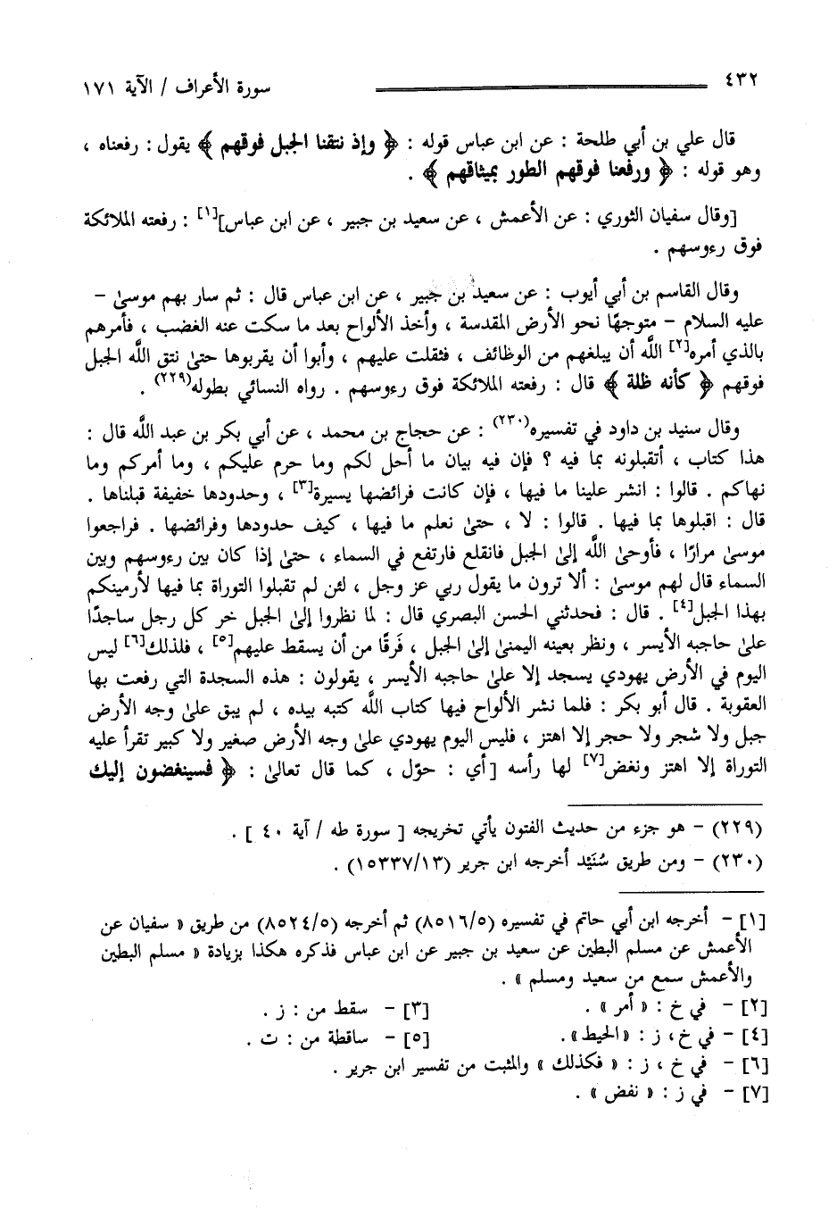 قَالَ عَلِيّ بْن أَبِي طَلْحَة عَنْ اِبْن عَبَّاس قَوْله " وَإِذْ نَتَقْنَا الْجَبَل فَوْقهمْ " يَقُول رَفَعْنَاهُ وَهُوَ قَوْله " وَرَفَعْنَا فَوْقهمْ الطُّور بِمِيثَاقِهِمْ " وَقَالَ سُفْيَان الثَّوْرِيّ عَنْ الْأَعْمَش عَنْ سَعِيد بْن جُبَيْر عَنْ اِبْن عَبَّاس رَفَعَتْهُ الْمَلَائِكَة فَوْق رُءُوسهمْ وَهُوَ قَوْله" وَرَفَعْنَا فَوْقهمْ الطُّور " وَقَالَ الْقَاسِم بْن أَبِي أَيُّوب عَنْ سَعِيد بْن جُبَيْر عَنْ اِبْن عَبَّاس قَالَ ثُمَّ سَارَ بِهِمْ مُوسَى عَلَيْهِ السَّلَام إِلَى الْأَرْض الْمُقَدَّسَة وَأَخَذَ الْأَلْوَاح بَعْدَمَا سَكَتَ عَنْهُ الْغَضَب وَأَمَرَهُمْ بِاَلَّذِي أَمَرَ اللَّه أَنْ يُبَلِّغهُمْ مِنْ الْوَظَائِف فَثَقُلَتْ عَلَيْهِمْ وَأَبَوْا أَنْ يُقِرُّوا بِهَا حَتَّى نَتَقَ اللَّه الْجَبَل فَوْقهمْ " كَأَنَّهُ ظُلَّة " قَالَ رَفَعَتْهُ الْمَلَائِكَة فَوْق رُءُوسهمْ رَوَاهُ النَّسَائِيّ بِطُولِهِ وَقَالَ سُنَيْد بْن دَاوُدَ فِي تَفْسِيره عَنْ حَجَّاج بْن مُحَمَّد عَنْ أَبِي بَكْر بْن عَبْد اللَّه قَالَ هَذَا كِتَاب أَتَقْبَلُونَهُ بِمَا فِيهِ فَإِنَّ فِيهِ بَيَان مَا أَحَلَّ لَكُمْ وَمَا حَرَّمَ عَلَيْكُمْ وَمَا أَمَرَكُمْ وَمَا نَهَاكُمْ ؟ قَالُوا اُنْشُرْ عَلَيْنَا مَا فِيهَا فَإِنْ كَانَتْ فَرَائِضهَا وَحُدُودهَا يَسِيرَة قَبِلْنَاهَا قَالَ اِقْبَلُوهَا بِمَا فِيهَا قَالُوا لَا حَتَّى نَعْلَم مَا فِيهَا كَيْف حُدُودهَا وَفَرَائِضهَا فَرَاجَعُوهُ مِرَارًا فَأَوْحَى اللَّه إِلَى الْجَبَل فَانْقَلَعَ فَارْتَفَعَ فِي السَّمَاء حَتَّى إِذَا كَانَ بَيْن رُءُوسهمْ وَبَيْن السَّمَاء قَالَ لَهُمْ مُوسَى أَلَا تَرَوْنَ مَا يَقُول رَبِّي عَزَّ وَجَلَّ لَئِنْ لَمْ تَقْبَلُوا التَّوْرَاة بِمَا فِيهَا لَأَرْمِيَنَّكُمْ بِهَذَا الْجَبَل .