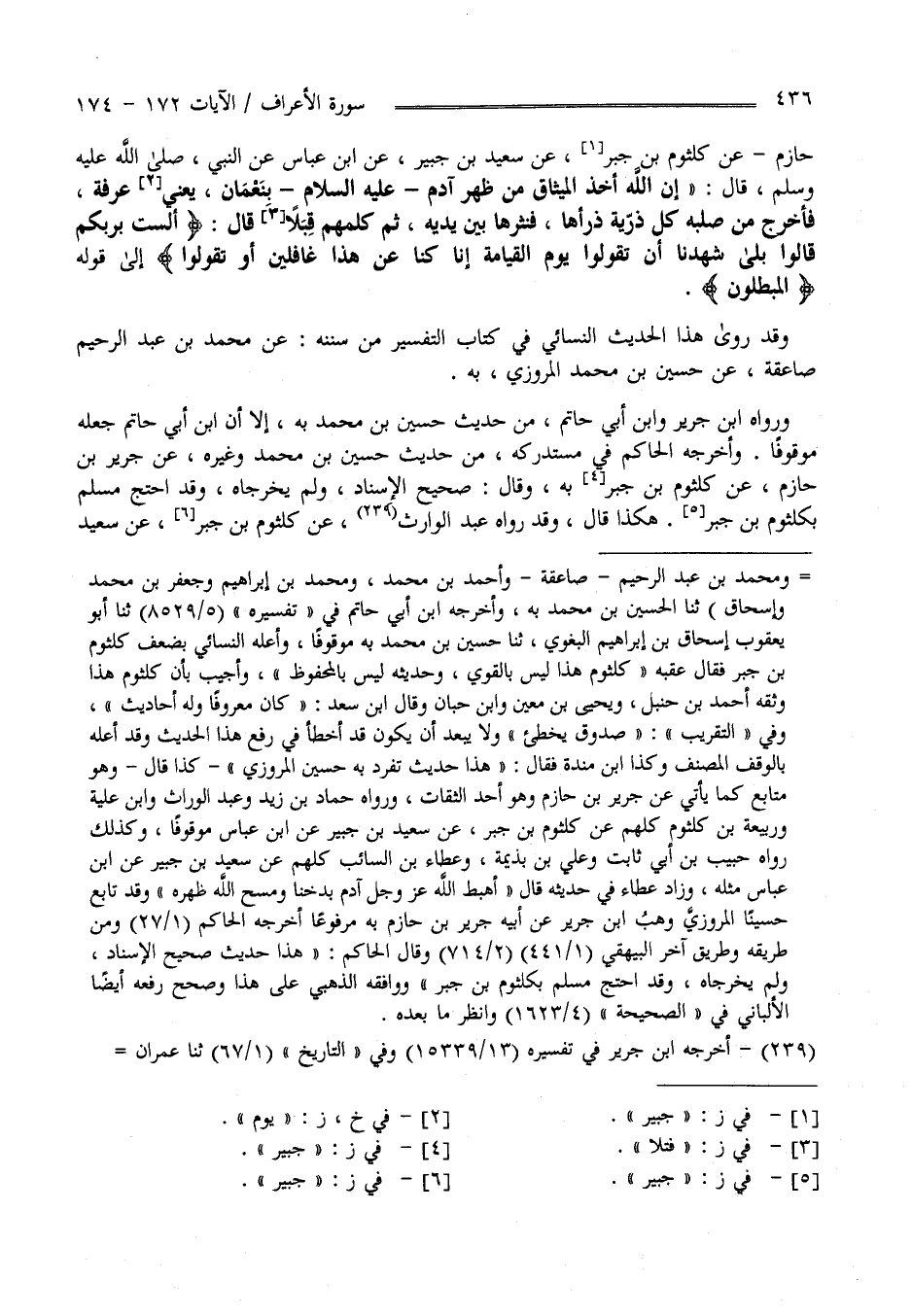 حَازِم عَنْ كُلْثُوم بْن جُبَيْر عَنْ سَعِيد بْن جُبَيْر عَنْ اِبْن عَبَّاس عَنْ النَّبِيّ صَلَّى اللَّه عَلَيْهِ وَسَلَّمَ قَالَ " إِنَّ اللَّه أَخَذَ الْمِيثَاق مِنْ ظَهْر آدَم عَلَيْهِ السَّلَام بِنَعْمَان يَوْم عَرَفَة فَأَخْرَجَ مِنْ صُلْبه كُلّ ذُرِّيَّة ذَرَأَهَا فَنَثَرَهَا بَيْن يَدَيْهِ ثُمَّ كَلَّمَهُمْ قِبَلًا قَالَ " أَلَسْت بِرَبِّكُمْ قَالُوا بَلَى شَهِدْنَا أَنْ تَقُولُوا يَوْم الْقِيَامَة إِنَّا كُنَّا عَنْ هَذَا غَافِلِينَ أَوْ تَقُولُوا - إِلَى قَوْله " الْمُبْطِلُونَ " وَقَدْ رَوَى هَذَا الْحَدِيث النَّسَائِيّ فِي كِتَاب التَّفْسِير مِنْ سُنَنه عَنْ مُحَمَّد بْن عَبْد الرَّحِيم صَاعِقَة عَنْ حُسَيْن بْن مُحَمَّد الْمَرْوَزِيّ بِهِ وَرَوَاهُ اِبْن جَرِير وَابْن أَبِي حَاتِم مِنْ حَدِيث حُسَيْن بْن مُحَمَّد بِهِ إِلَّا أَنَّ اِبْن أَبِي حَاتِم جَعَلَهُ مَوْقُوفًا وَأَخْرَجَهُ الْحَاكِم فِي مُسْتَدْرَكه مِنْ حَدِيث حُسَيْن بْن مُحَمَّد وَغَيْره عَنْ جَرِير بْن حَازِم عَنْ كُلْثُوم بْن جُبَيْر بِهِ وَقَالَ صَحِيح الْإِسْنَاد وَلَمْ يُخَرِّجَاهُ وَقَدْ اِحْتَجَّ مُسْلِم بِكُلْثُومِ بْن جُبَيْر هَكَذَا قَالَ .